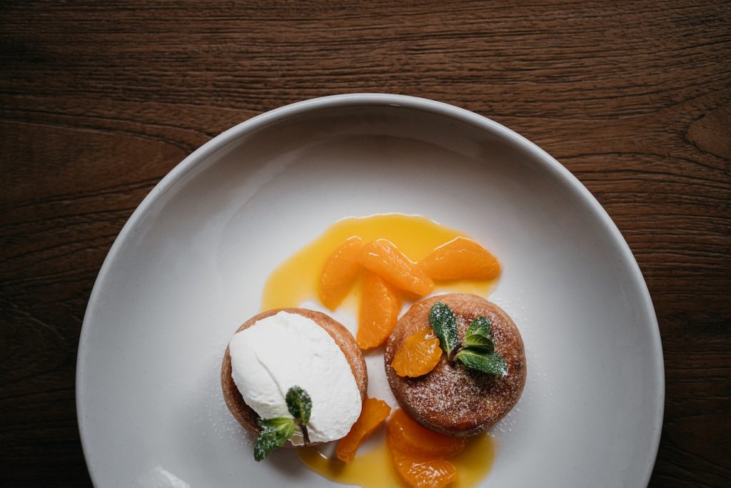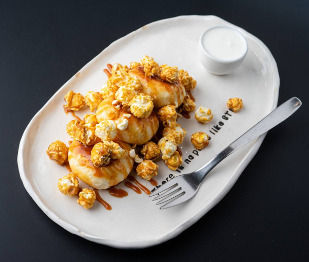 Кстати, их не жарят на масле, а выпекают в духовке. Подаются на выбор со сметаной или взбитой сметаной, также в дополнение можно выбрать соус из лесных ягод, мусс фейхоа или сорбет из маракуйи.