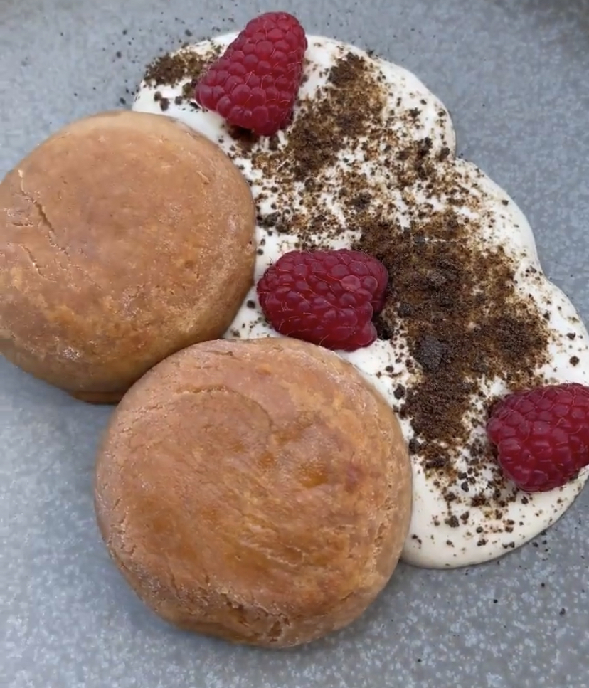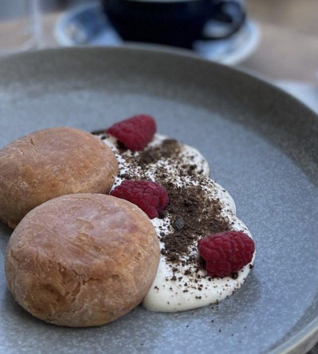 Одни из самых инстаграмных сырников в нашей подборке, подаются они с малиновым кремом и творожным муссом.