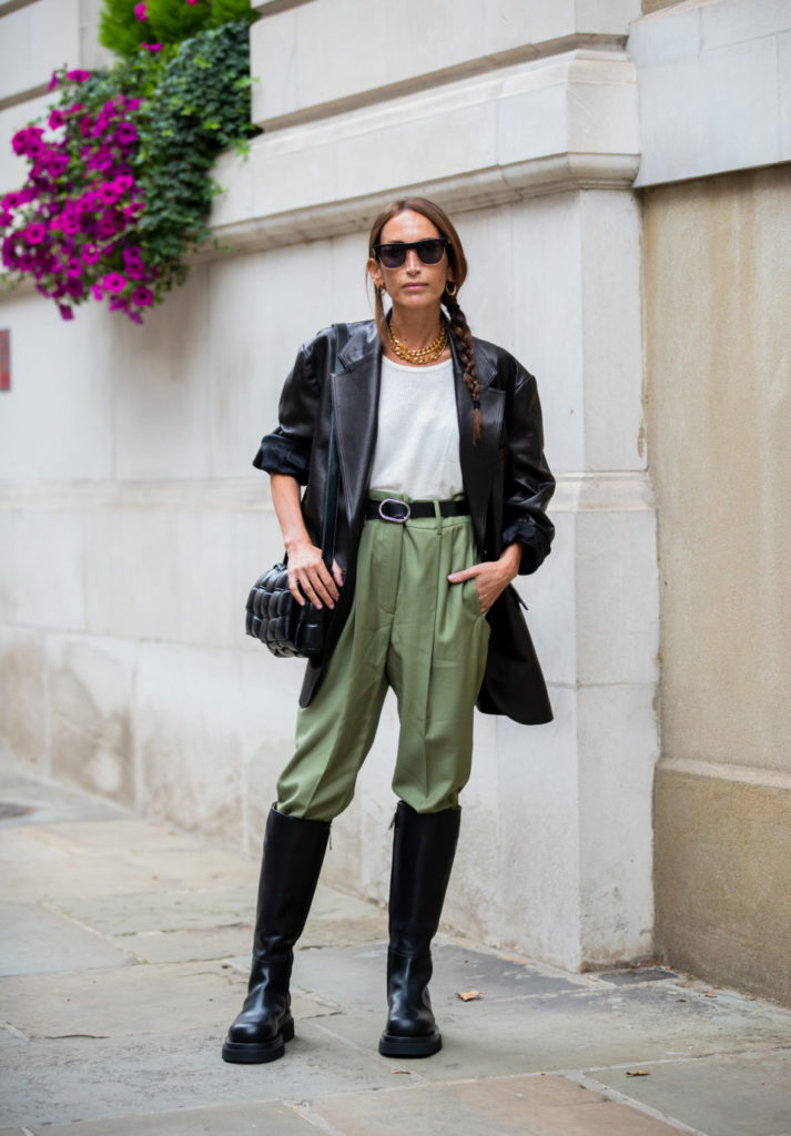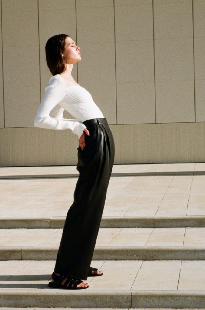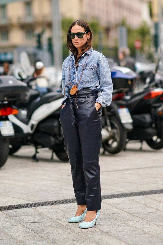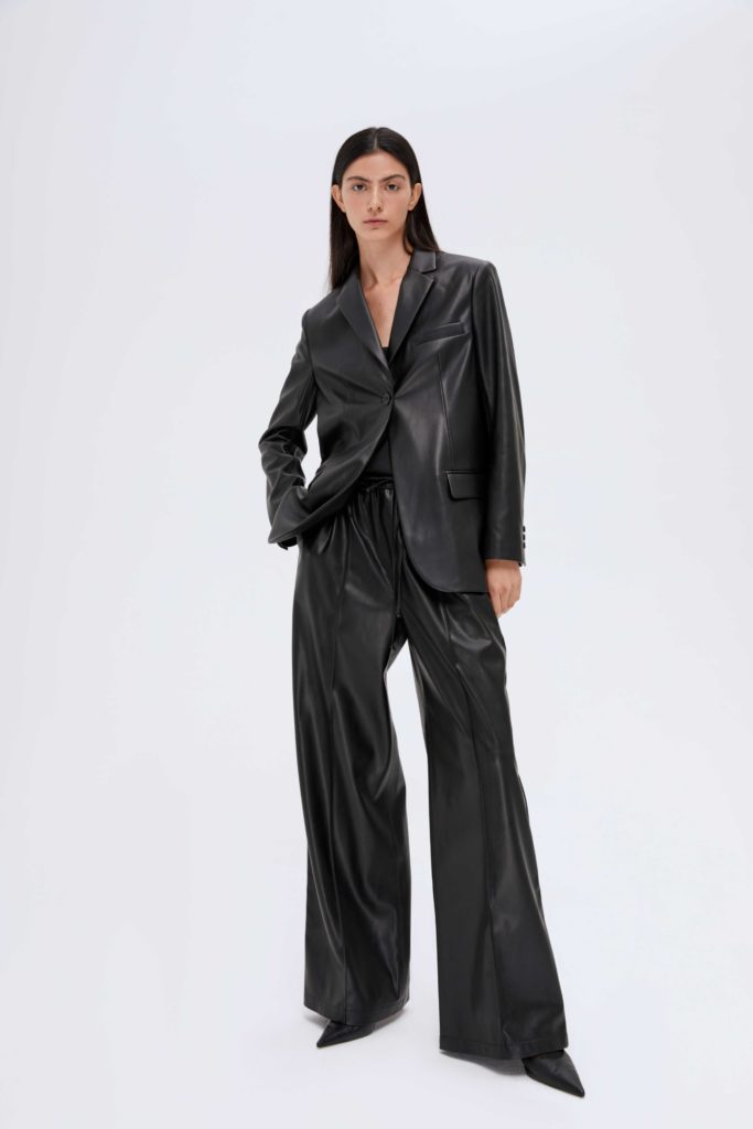 Кожаные брюки – наш фаворит среди трендов. Мы советуем выбирать джоггеры или широкие модели. С чем носить? Тут вариантов очень много. От свитеров с высоким горлом до водолазок, пиджаков и кожаных рубашек.