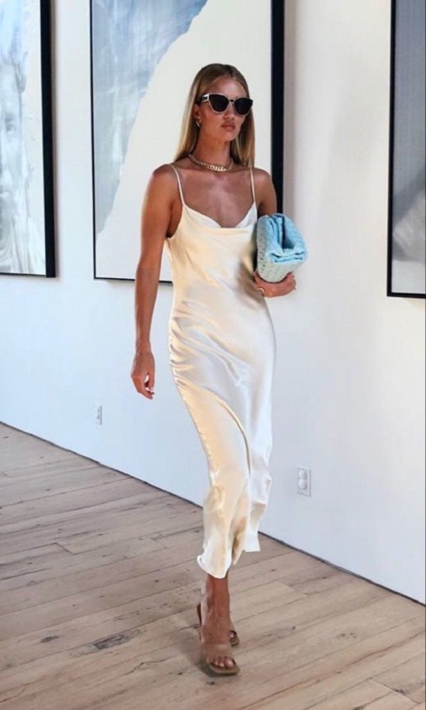 Для нас платье-комбинация – самый классический и идеальный вариант, который можно легко и стильно обыграть. Например, дополнить образ мюлями с квадратным мысом или акцентной сумочкой. Главное в таком платье – правильно подобрать длину. Нам все-таки кажется, что для выпускного лучше всего остановиться на модели миди.