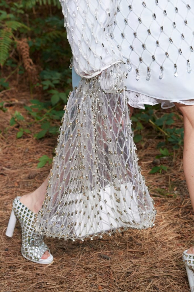 Рыболовные сети – еще один тренд, который буквально захватил коллекции SS 21. И если David Koma предлагает носить их вместо топа, то Nanushka и Burberry используют тренд в качестве аксессуара. Последний дополняет сумку в таком стиле сверкающими камнями.