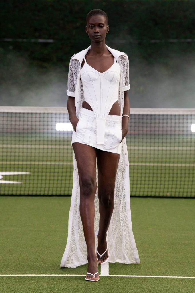 Сетка занимает особое место в коллекциях SS 21. В коллекции Nanushka она служит дополнением к образу, поэтому модель небрежно накидывает ее поверх рубашки. А вот на показе David Koma рыболовная сеть – и вовсе неотъемлемая часть аутфита. Дизайнер предлагает носить юбку в таком стиле в дуэте с бра.