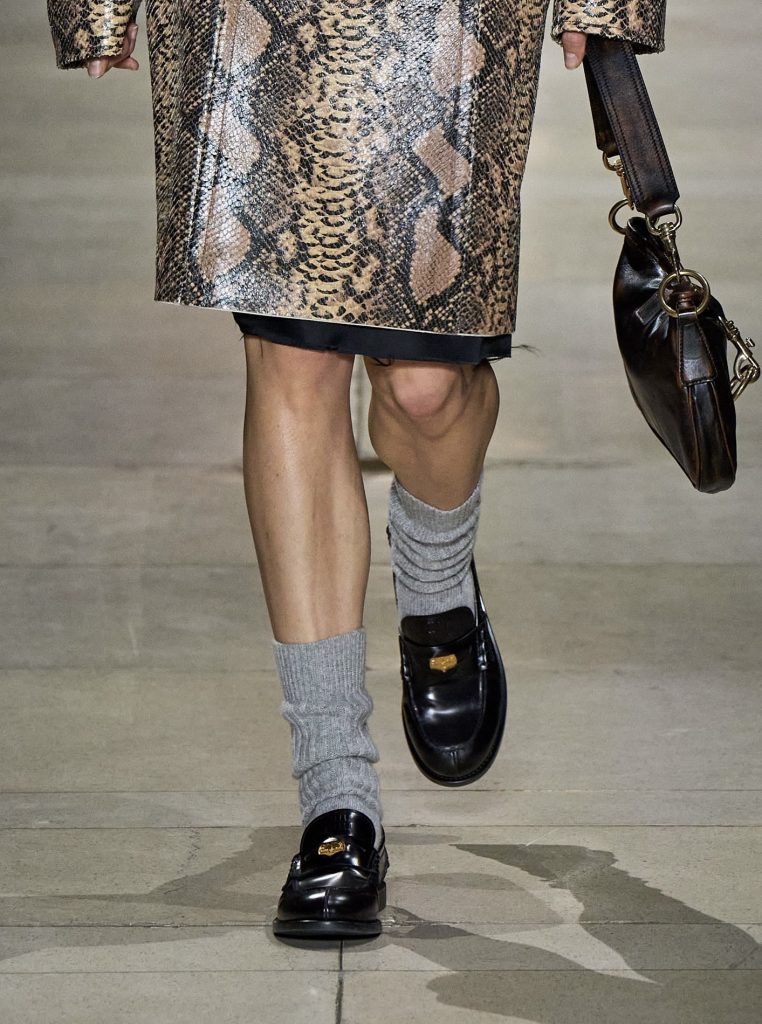Лоферы – важный элемент гардероба преппи (студентов Лиги плюща). А так как эта эстетика доминирует в сезоне осень-зима/2022, блогеры и инфлюенсеры мимикрировали под студентов Оксфорда или Гарварда. Университетские бомберы, оверсайз кардиганы, галстуки и, конечно, лоферы в дуэте с белыми носками. Последние появились и в коллекциях модных брендов. Наш фаворит – грубая модель Miu Miu.