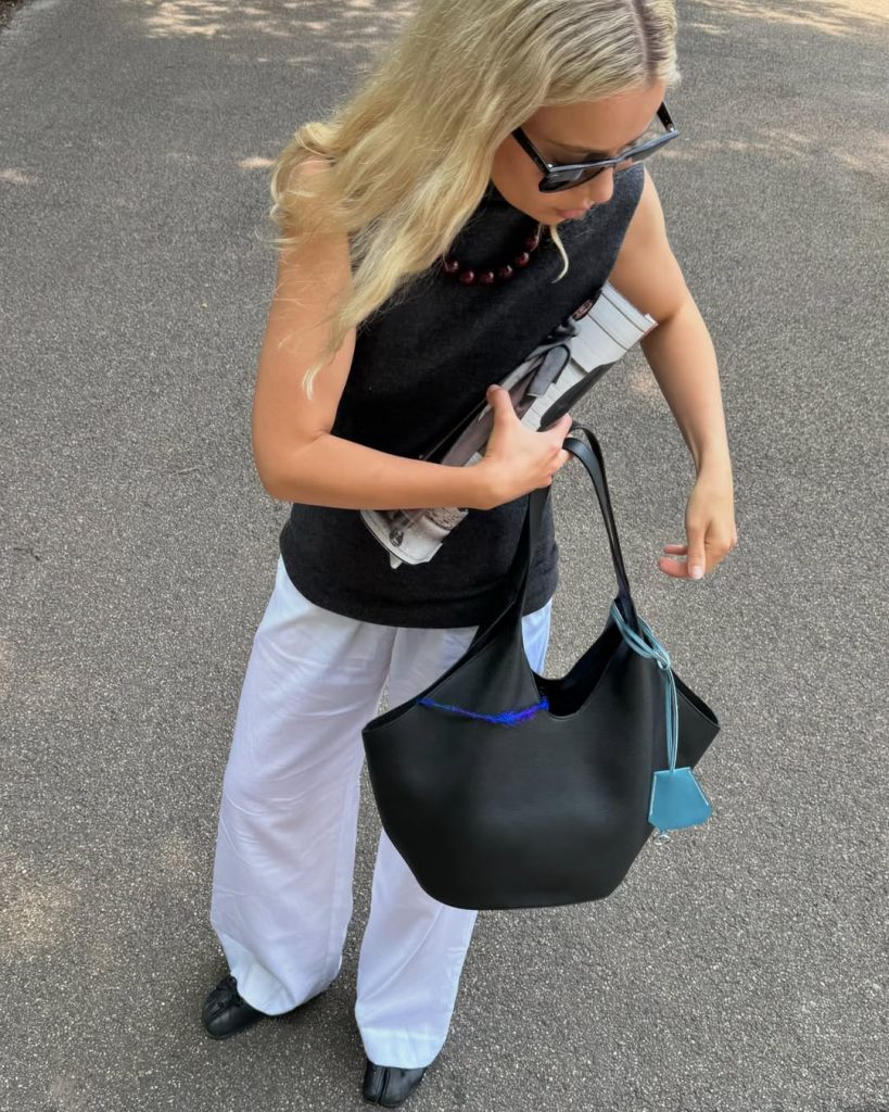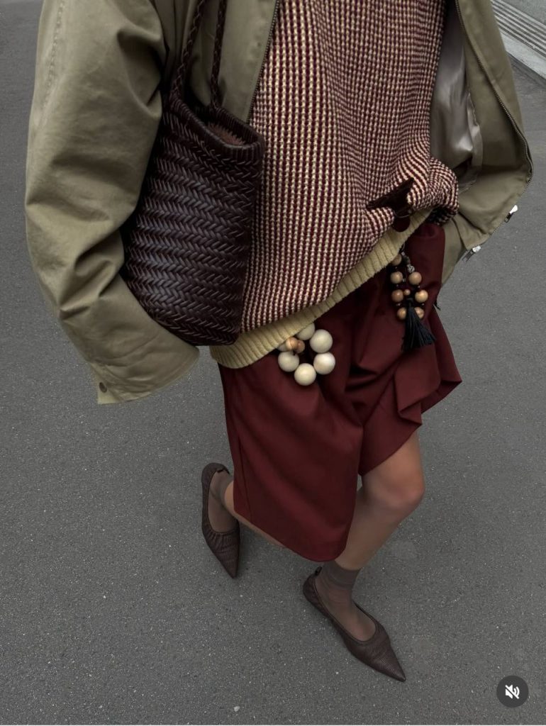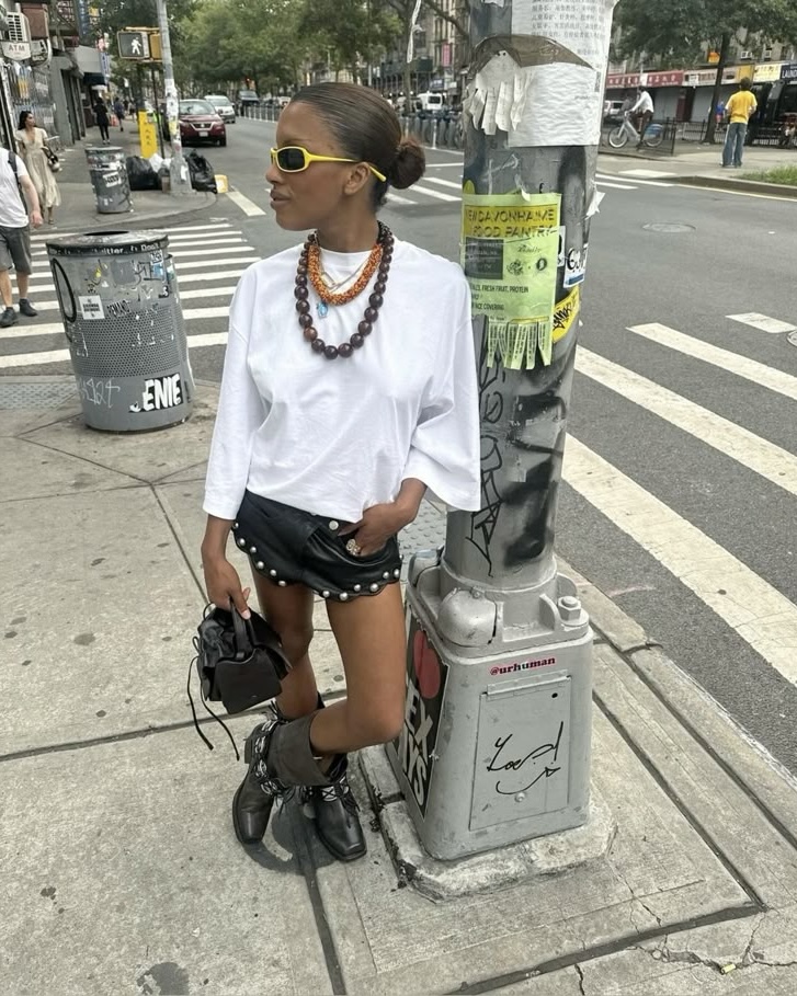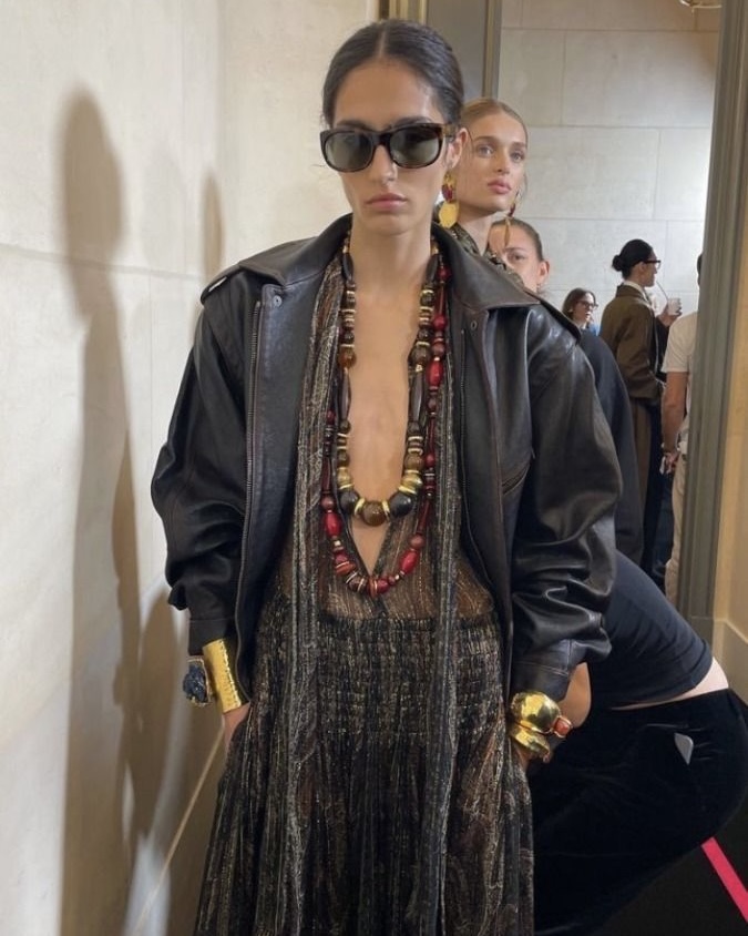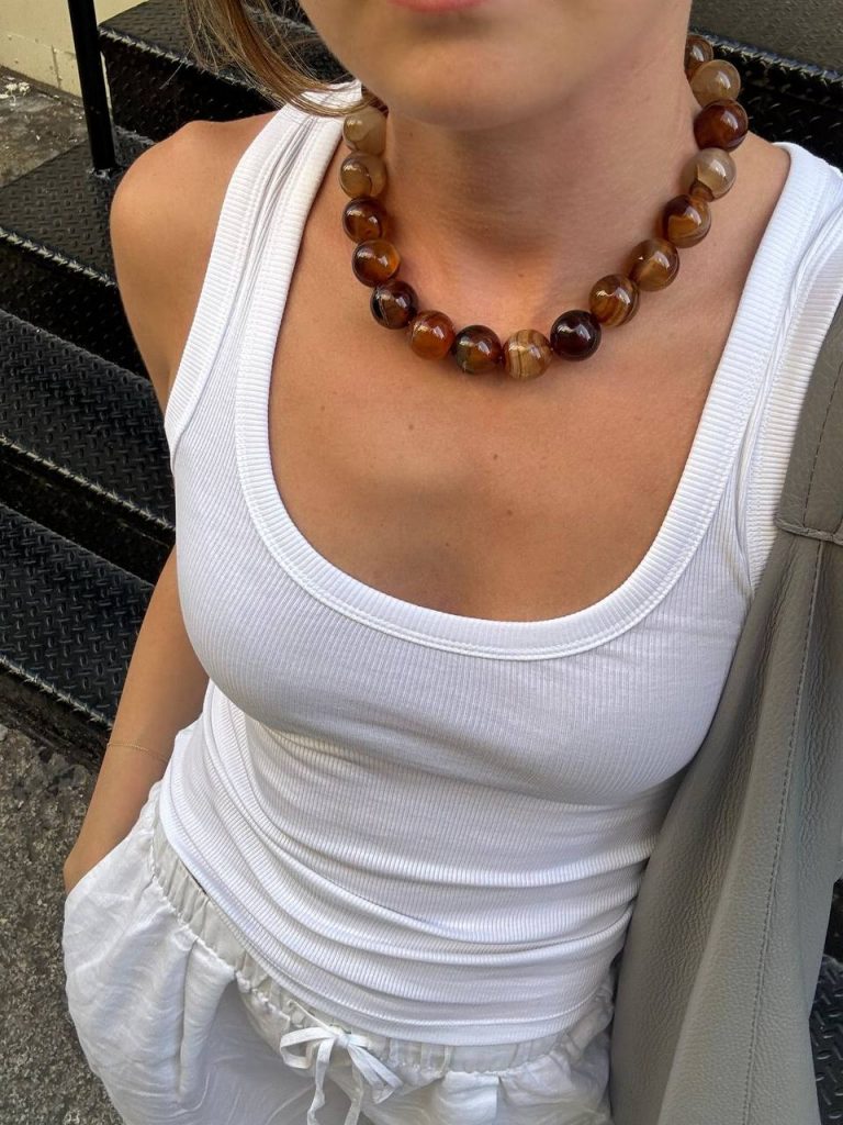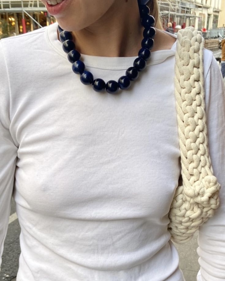 Фэшн-инфлюенсеры подхватили волну и превратили гигантские бусы в главный тренд сезона. Они используют их в качестве обвеса для сумки, носят ремни из деревянных бусин, бесконечно длинные «бабушкины» ожерелья или выбирают гигантские чокеры. Особенно тренд полюбился зумерам, уставшим от глянцевой идеальности и скучных аккуратных жемчужных нитей. И не думай, что этот аксессуар только для подиума. Даже в строгом офисном дресс-коде гигантские бусы автоматически сделают твой образ extremely chick.