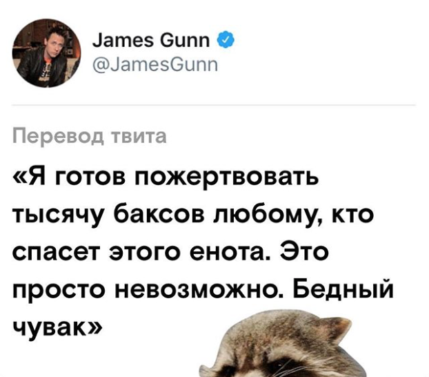Даже режиссёр «Стражей Галактики» Джеймс Ганн (51) был готов пожертвовать тысячу долларов на спасение животного.