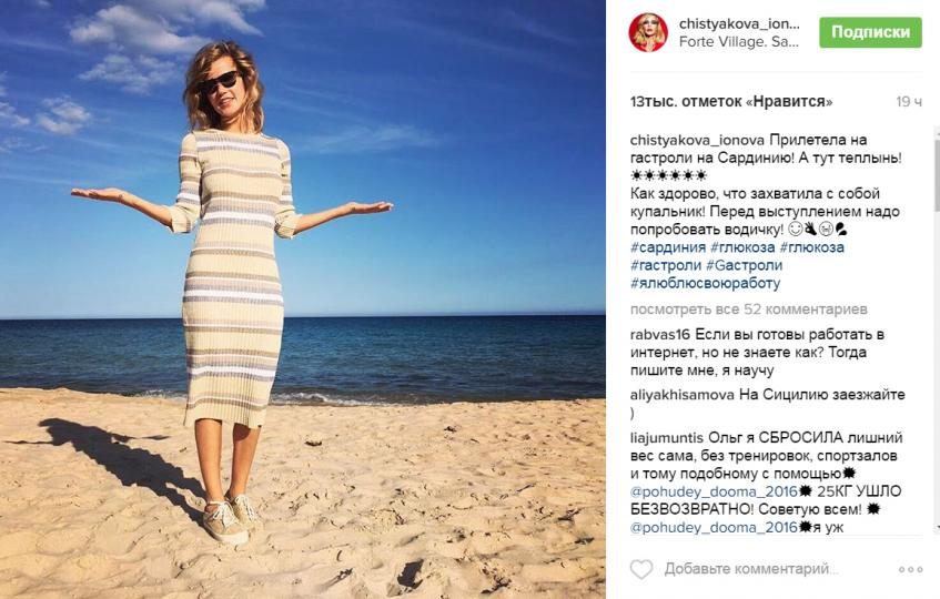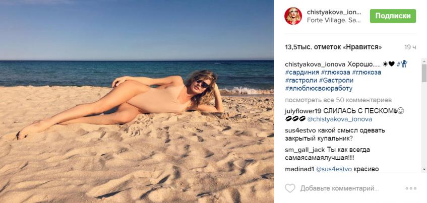 Буквально через неделю певице Наталье Ионовой (29), более известной под псевдонимом Глюк'oZa, исполнится 30 лет. Однако, вместо того чтобы готовиться к торжеству, певица отправилась на гастроли в Сардинию. Но, несмотря на загруженный график, не забыла звезда и о своих поклонниках, порадовав их новым фото с пляжа.