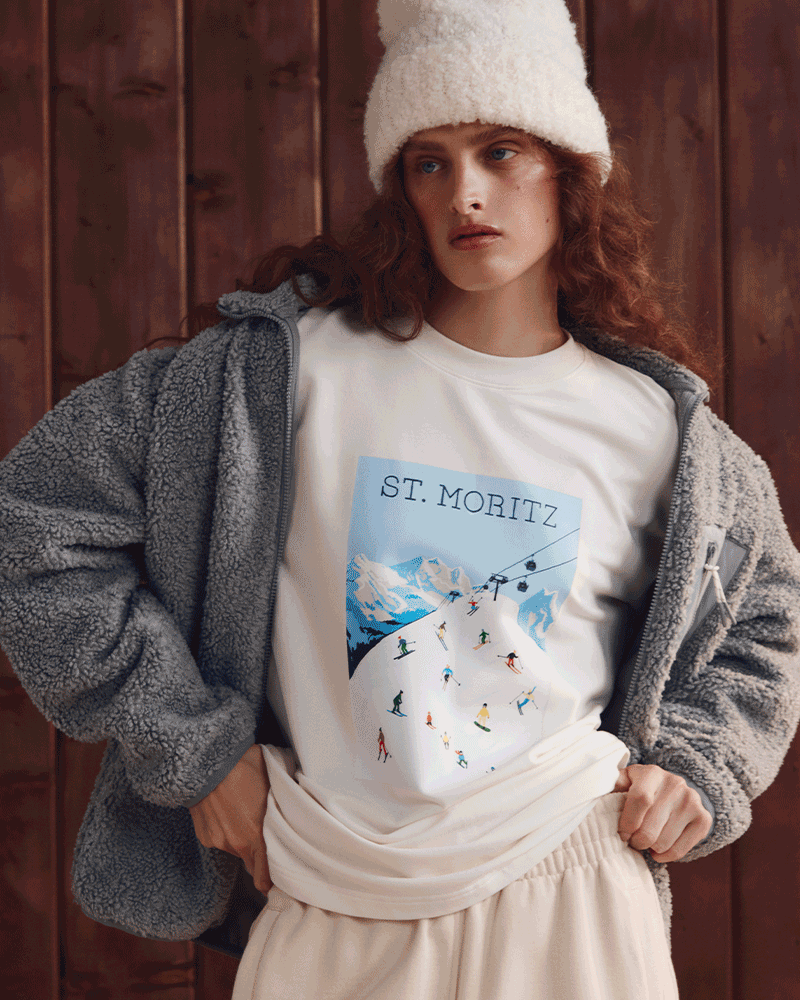 Для капсулы après-ski дизайнеры бренда выбрали спокойную цветовую гамму – светлые бежевые, серые и голубые оттенки. Однако и о ярких акцентах не забыли. Команда belle you разработала специальный принт, который иллюстрирует пейзажи Аспена и Санкт-Морица. Так, в коллекции появились оверсайз-футболка из футера и объемное худи с начесом и капюшоном, которые идеально передают атмосферу горнолыжных курортов.
