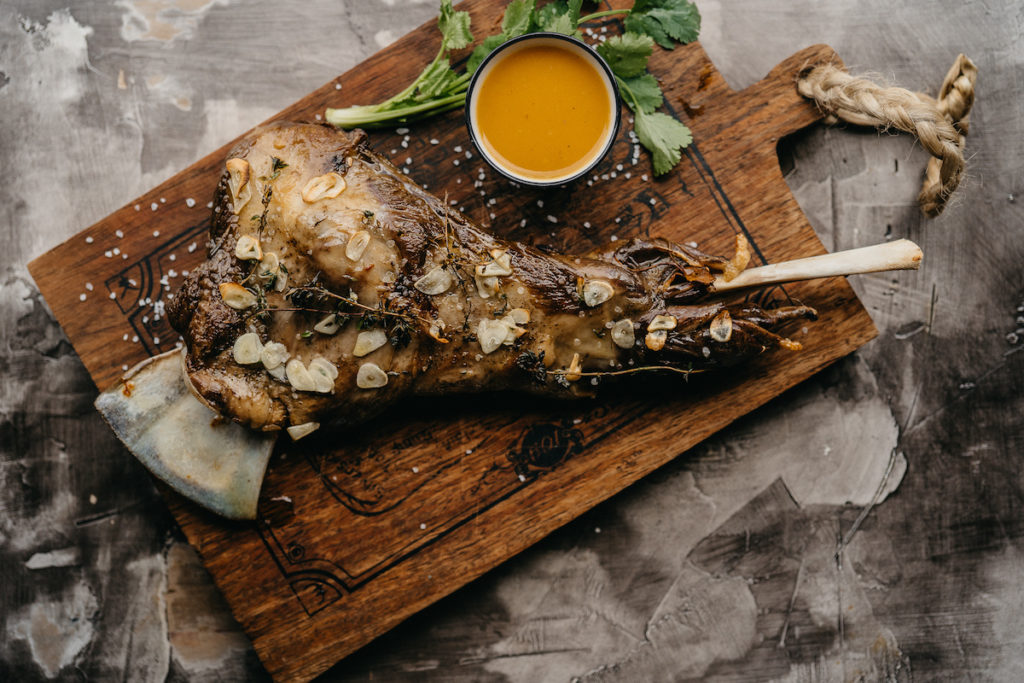 Закуски: брускетты с куриным паштетом и черносливом и со сладкими томатами и страчателлой (по 100 руб.), крупные греческие оливки (300 руб./100 г.) и маслины (310 руб./100 г.), подкопченную салями (220 руб./50 г.). На обед –– куриный суп с лапшой (260 руб.) или фирменный томатный суп с морепродуктами (580 руб.). Лангустины-гриль (790 руб.), телячьи щечки с пюре из сельдерея (450 руб.) и ароматная томленая лопатка ягненка (1840 руб. на двоих) подойдут для ужина.