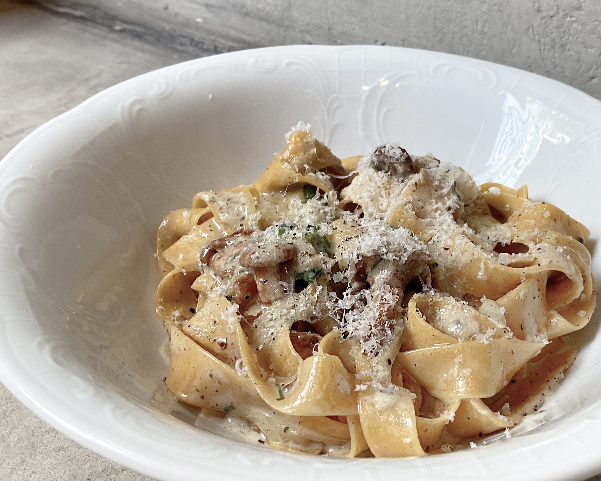 Есть и более классический вариант – домашняя паста с лисичками под грибным соусом со страчателлой.
