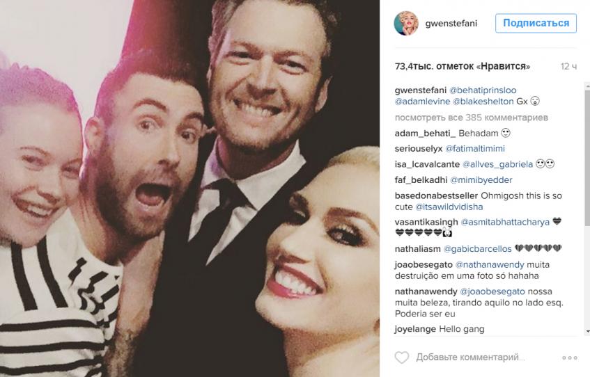 Удивительный снимок, на котором запечатлены звезды, опубликовала в своем Instagram сама Гвен. На фото ей удалось запечатлеть не только себя и Блейка, но и веселого Адама и его беременную супругу. Стоит ли говорить, как радовались поклонники, увидев такой кадр. «Лучшая команда в мире!», «Восхитительно!», «Боже мой, лучшее двойное свидание, что я видел», — писали они.