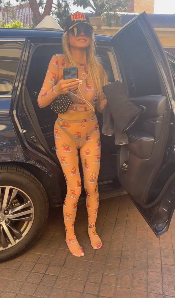 Звезда решила доказать всем, что колготки могут быть полностью самостоятельной частью костюма и не требуют никаких юбок и брюк. Кстати, это целый костюм: сверху Хайди надела такой же укороченный полупрозрачный топ с длинным рукавом. Такой откровенный наряд модели украшают забавные детские рисунки, а под ним виднеется черный комплект белья.