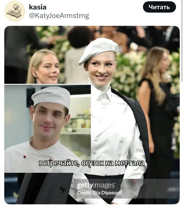 Один из юзеров сети Х* заметил особое сходство костюма актрисы с персонажем Марка Богатырева – Максимом Лавровым, которого в проекте также называли «огузок». Так и появился мем: «Встречайте, «огузок» на Met Gala».