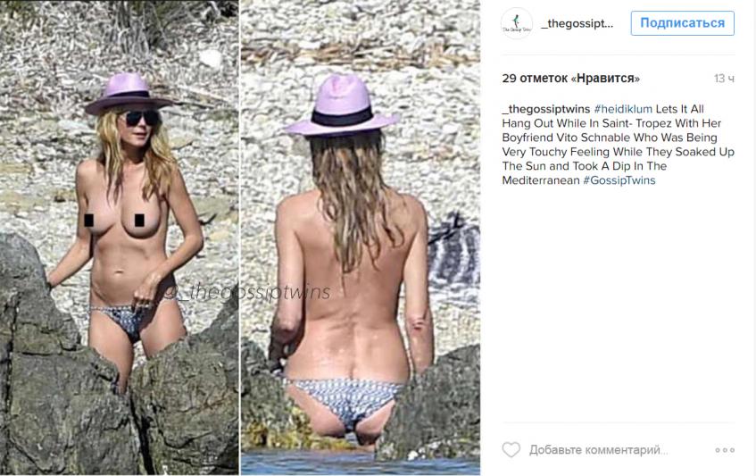 Вчера Хайди Клум (42) поразила нас своим выходом в Каннах — под руку с молодым бойфрендом Вито Шнабелем (29) и в облегающем серебряном платье. Сегодня еще новости! Сначала папарацци застали Хайди на пляже топлес. Она отдыхала с возлюбленным.