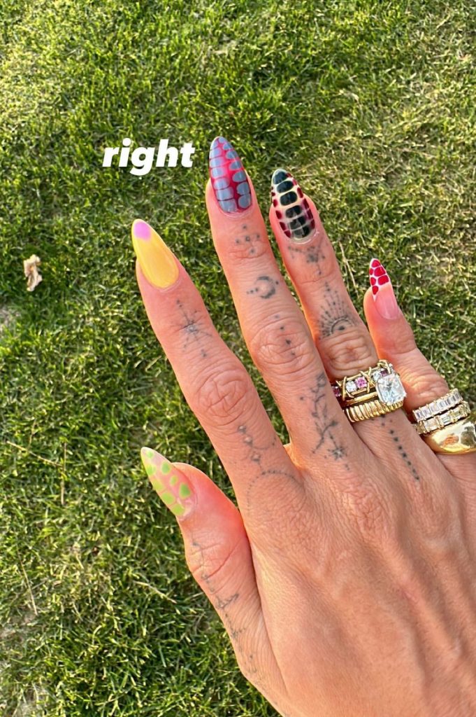 На днях звезда выложила фотографии, на которых мы видим маникюр с обилием разных принтов и ярких красок. Одни ногти были дополнены неоновыми точкам, другие крокодиловым принтом, а третьи цветными разводами. На Хейли это совсем не похоже, поэтому мы были удивлены.