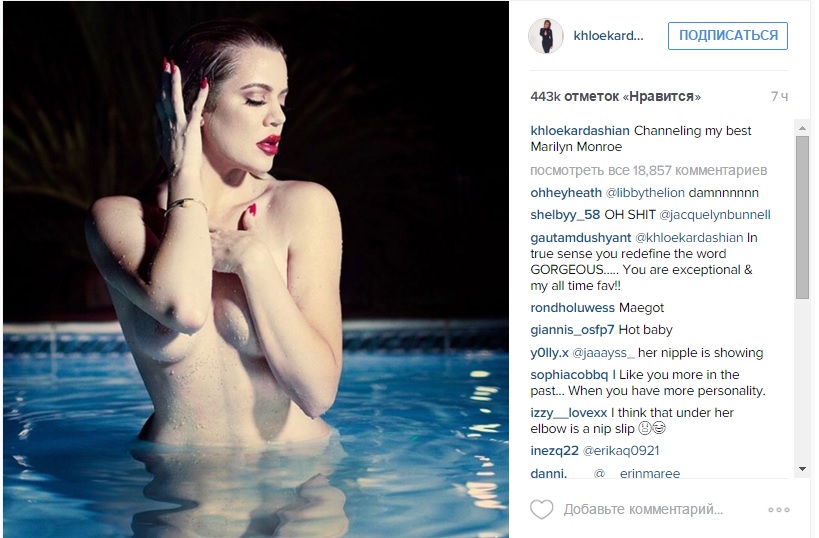 Хлои выложила в Instagram фото из очень откровенной фотосессии, на котором она изображена абсолютно голой в бассейне. Девушка подписала снимок: «Прокладываю путь к Мерилин Монро». Стоит отметить, что поклонники пришли в полнейший восторг о такого потрясающего снимка и завалили звезду комплиментами.