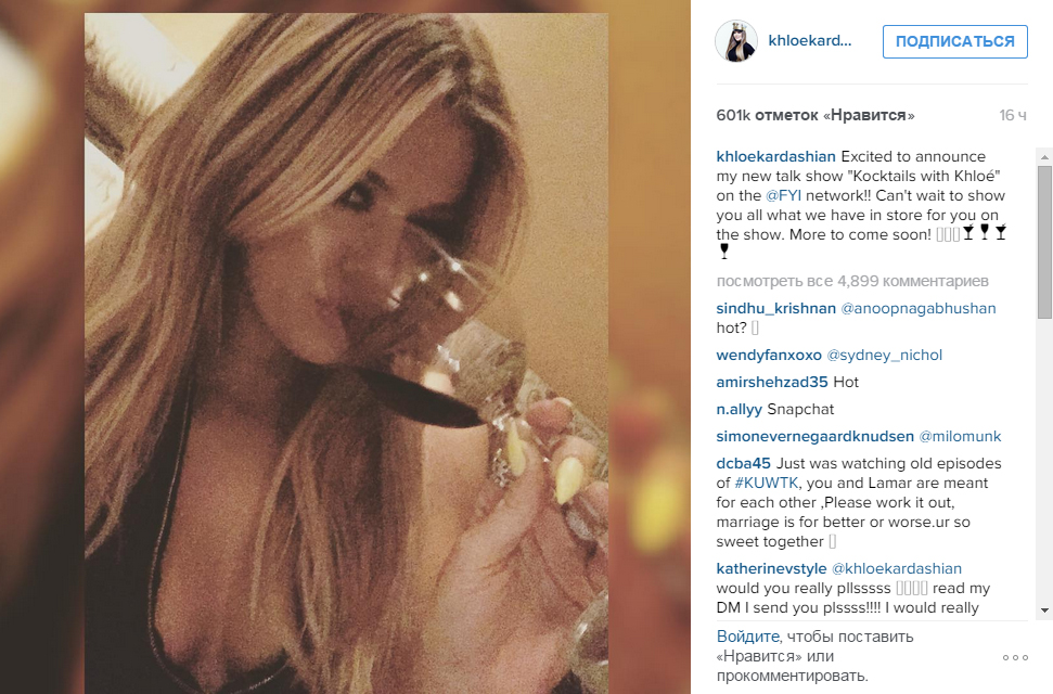 Об этом сообщила сама девушка через Instagram. Звезда опубликовала многозначительную фотографию с бокалом в руке и подписью: «Рада объявить о своем новом шоу «Коктейли с Хлои», который выйдет на FYI network! Не могу дождаться того, чтобы показать вам все, что у нас есть. Скоро будет больше!»