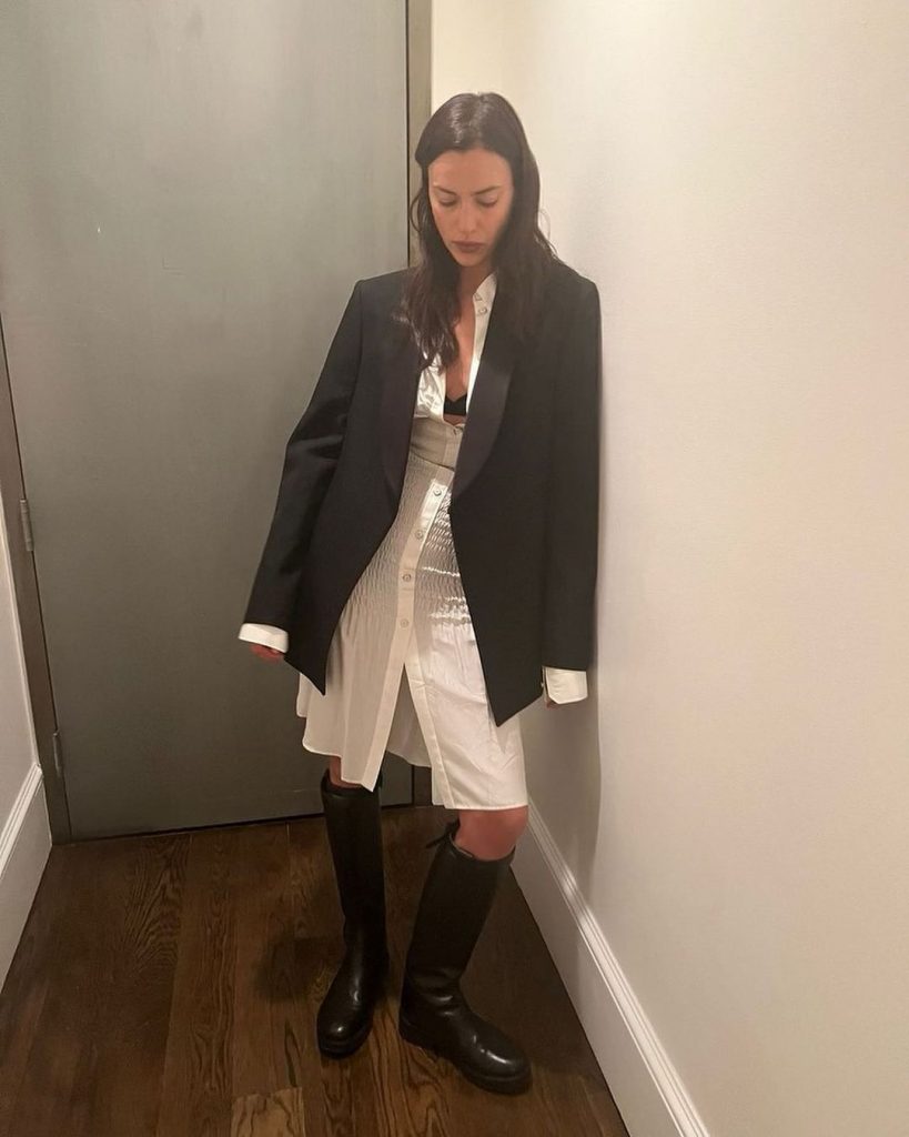 Перед поклонниками модель предстала в белом мини, которое дополнила черными высокими сапогами и пиджаком. Волосы звезда подиумов предпочла оставить распущенными. Идеальный аутфит на лето!