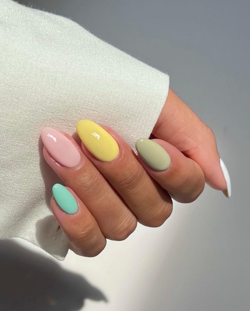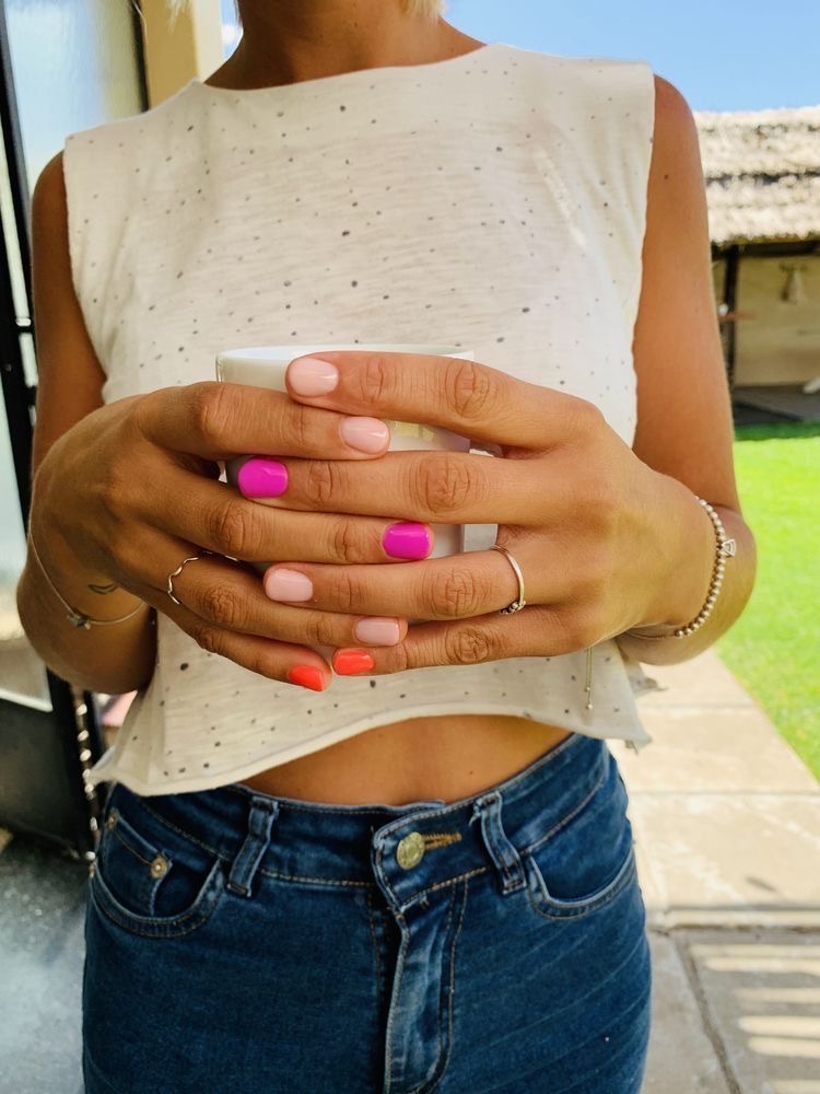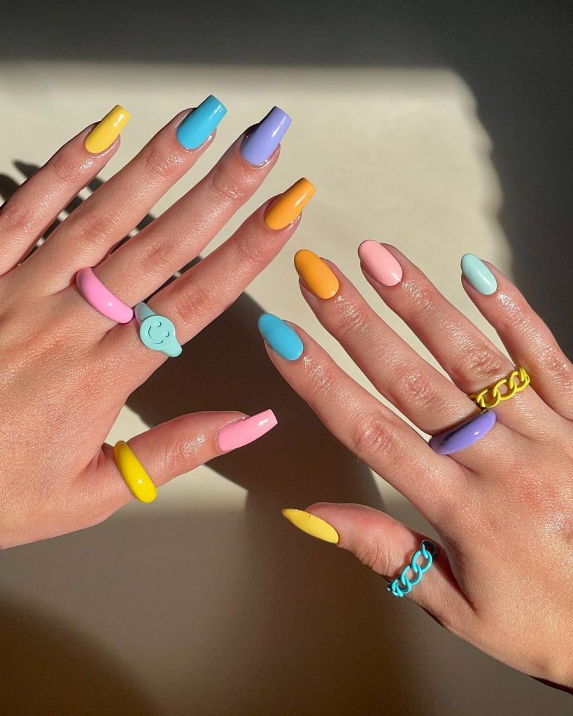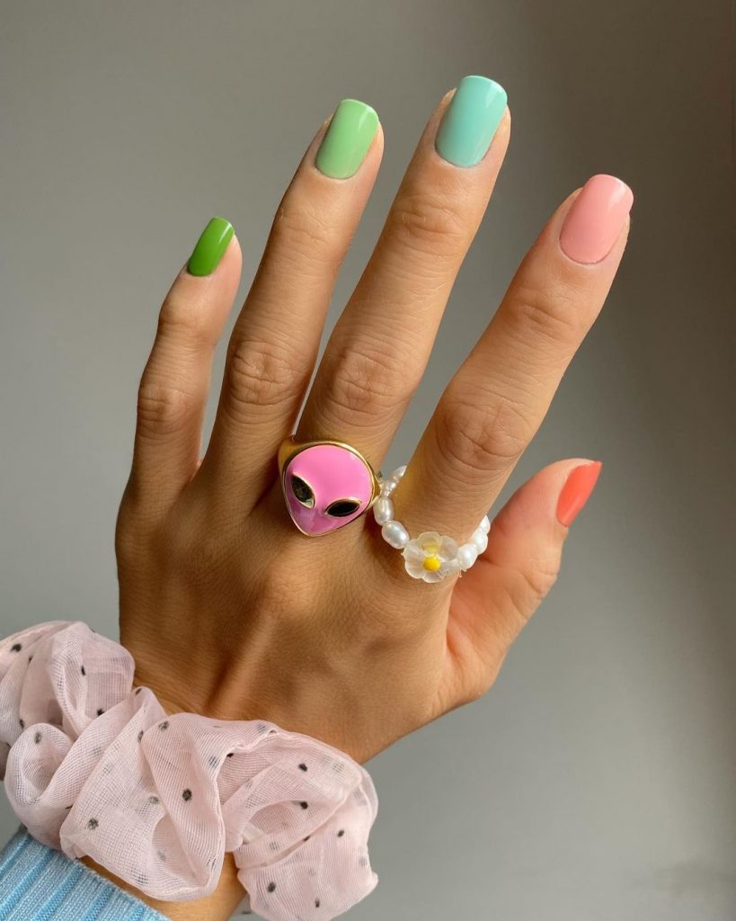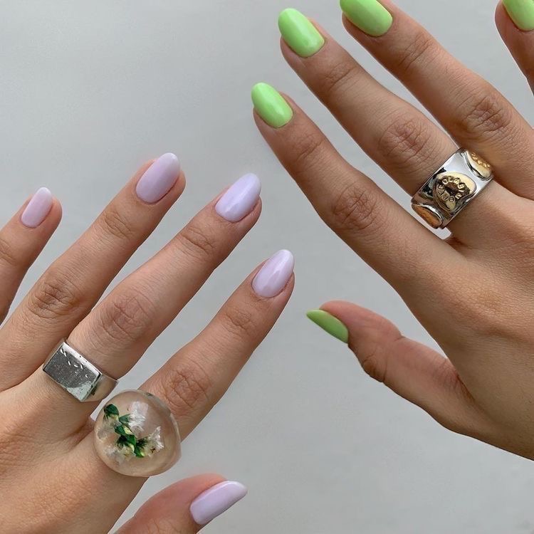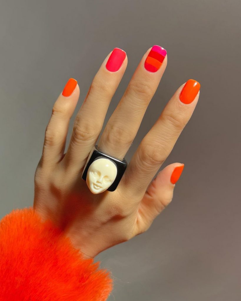 Другой вариант — совместить контрастные оттенки, сделав на одной руке более светлый, а на другой более темный цвет маникюра. Ну, а любителям очень ярких ногтей можно долго не выбирать из цветовой гаммы, а взять самые насыщенные оттенки.