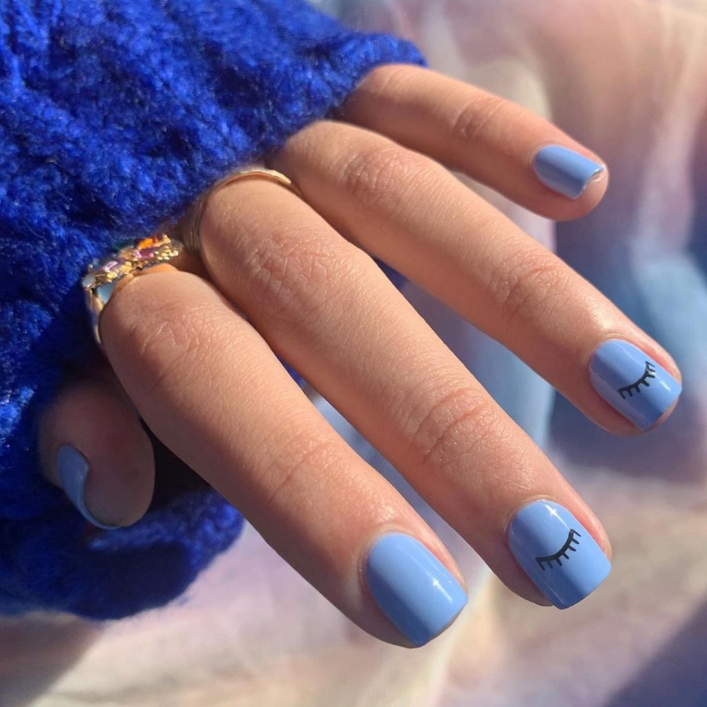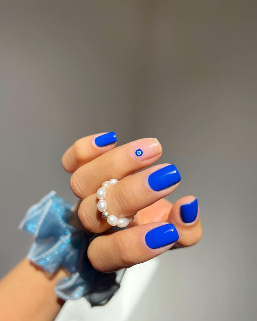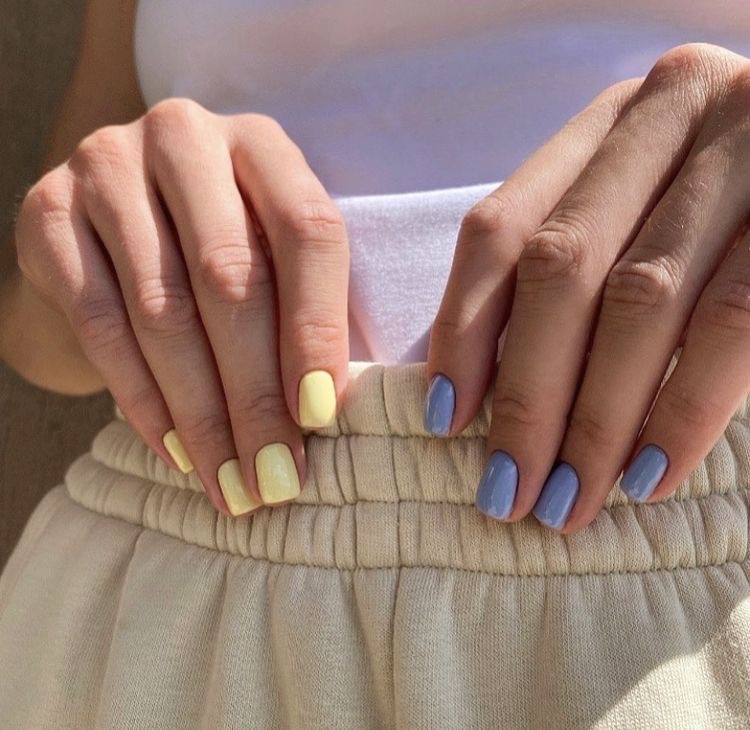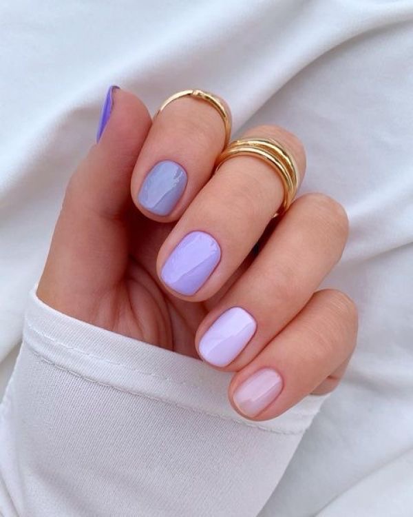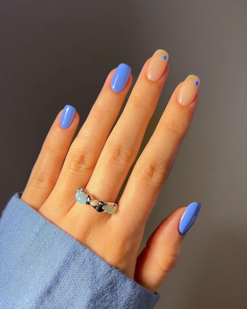Один из вариантов разнообразить однотонное покрытие — совместить в маникюре несколько оттенков. Например, выбрать смежные между собой цвета (синий, кобальтовый, голубой, ультрамарин), тем самым сделав градиент не на одном ногте, а на всей руке.