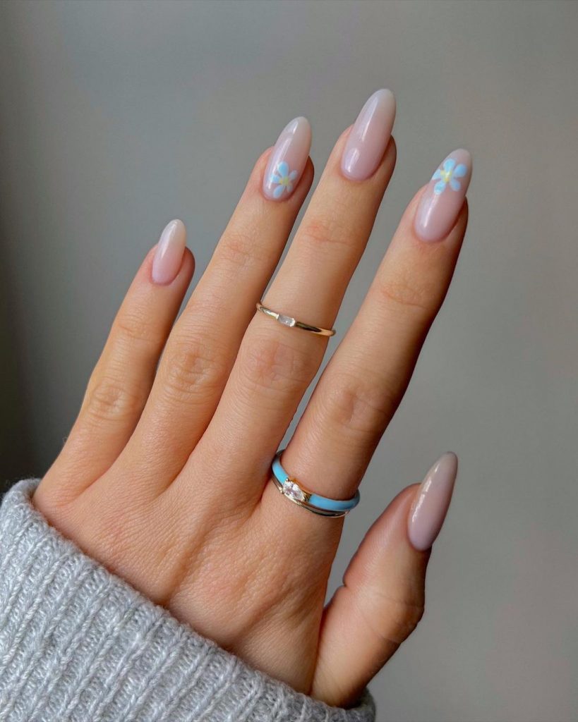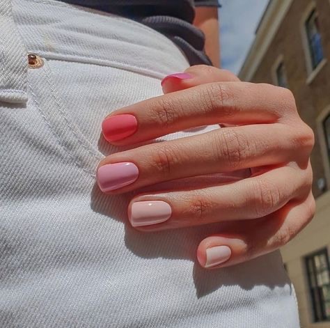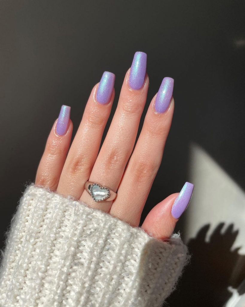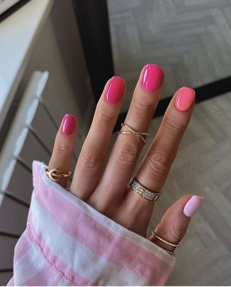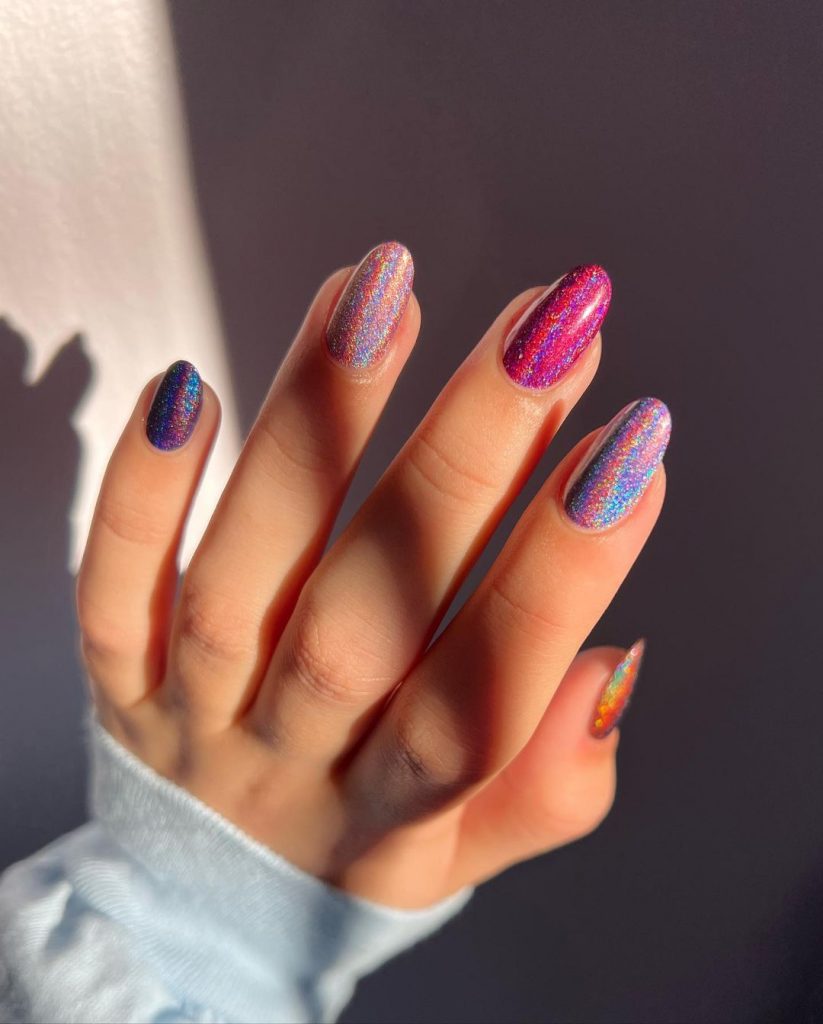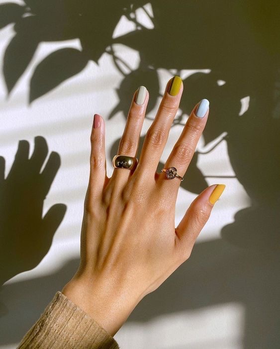 Один из вариантов разнообразить однотонное покрытие — совместить в маникюре несколько оттенков. Например, выбрать смежные между собой цвета (синий, кобальтовый, голубой, ультрамарин), тем самым сделав градиент не на одном ногте, а на всей руке.