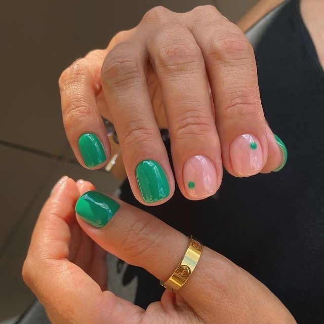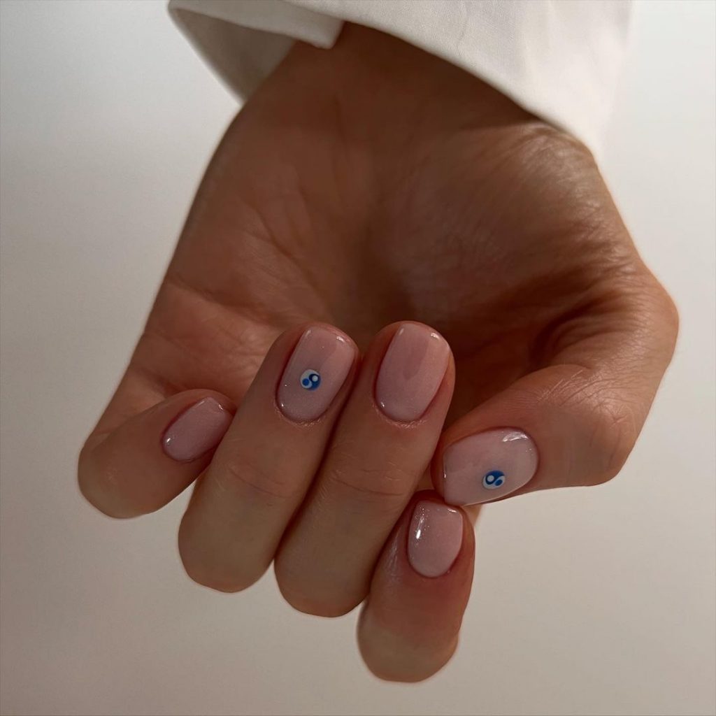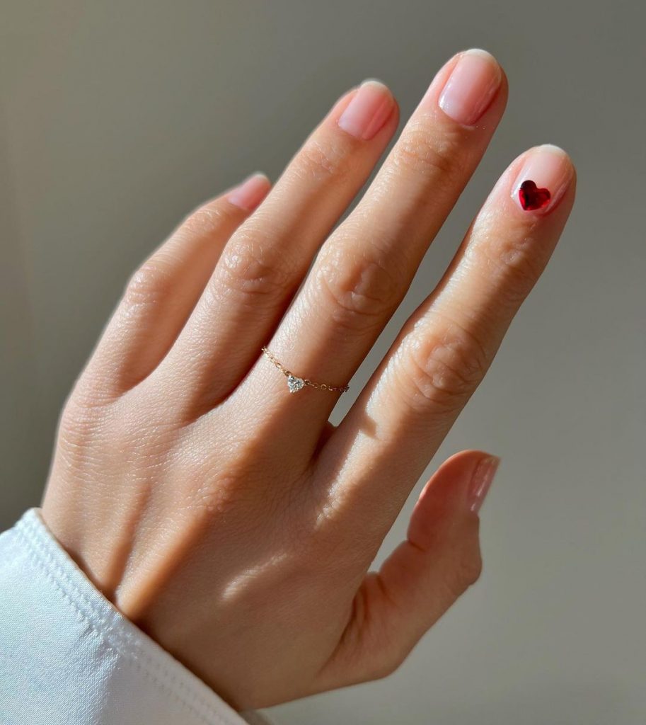 Сделать минималистичный дизайн только на одном или двух ногтях — еще один вариант для тех, кто устал от однотона. Точки, сердца, полоски, геометрия, небольшие рисунки, — все это мастер быстро может воплотить на ногтях и маникюр будет выглядеть интереснее.