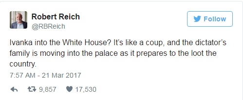 Президента США моментально обвинили в «кумовстве», причем не только СМИ и ненавистники Трампа, но и известные политики. Например, бывший министр труда США Роберт Райх написал в Twitter: «Иванка в Белом доме? Напоминает переворот: семья диктатора направляется во дворец, чтобы начать грабить страну».