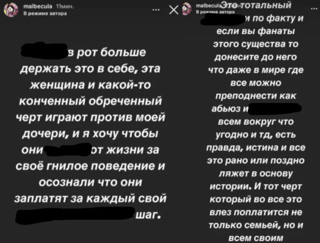 Недавно в «Историях» Мальбэка появились записи, в которых музыкант не скрывает эмоций и обвиняет Варнину в том, что она не дает ему видеться с ребенком, спекулирует на семейном разладе и угрожает, что та ответит за все. Также музыкант пишет о «черте», который имеет влияние на Сюзанну и сейчас находится рядом с ней. Вскоре пост был удален, но пользователи уже пытаются разгадать, кто же этот таинственный приближенный к артистке.