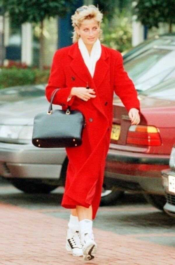 Леди Ди не скрывала свою любовь к кроссовкам и надевала их при любом удобном случае: и с джинсами, и с велосипедками, и даже с красным пальто. Так что тренд на casual + sport – во-многом заслуга Дианы.
