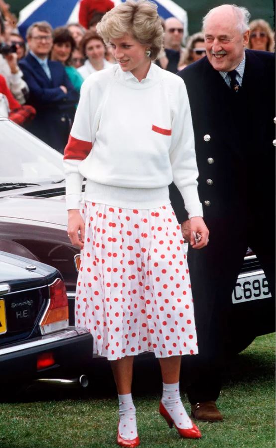 Помнишь, как прошлой осенью fashion-инфлюенсеры стали носить лоферы с гольфами, а босоножки и туфли – с яркими носками. Последний прием еще в 80-х подметила Диана: отсюда и ее образ с красными лодочками и носками в горошек.