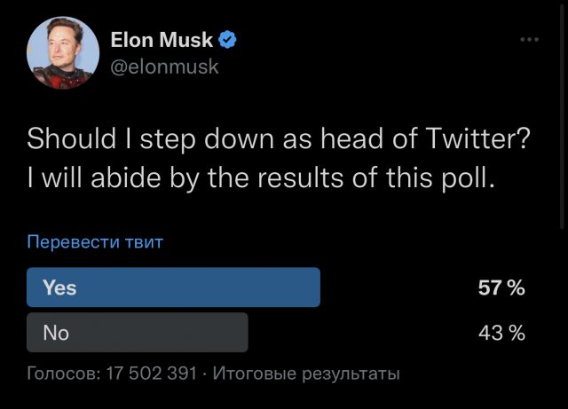 Решение Илона уйти в отставку было принято после того, как он провел опрос в Twitter, спрашивая, хотели бы пользователи платформы, чтобы он остался на своем посту: «Должен ли я уйти с поста главы Twitter? Я поступлю в соответсвии с результатами опроса», – написал он. 57,5% участников заявили, что Маск должен отказаться от своей должности.