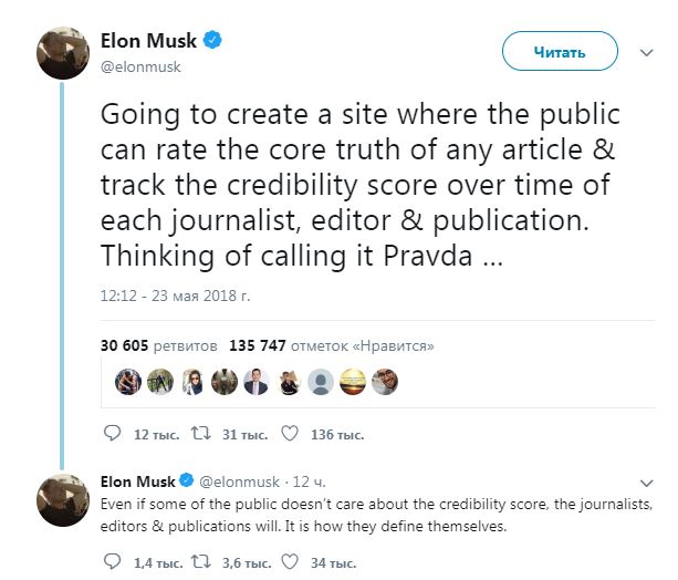 «Собираюсь создать сайт, на котором посетитель сможет оценивать истинность любой статьи и отслеживать изменения уровня доверия для каждого журналиста, редактора и публикации. Подумываю назвать его Pravda», — написал Маск в Twitter.