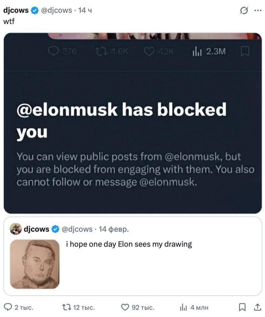Попытка художника привлечь внимание знаменитости обернулась конфликтом с миллиардером. Пользователь, который решил поделиться своим творчеством с Илоном Маском, теперь у него в блоке.