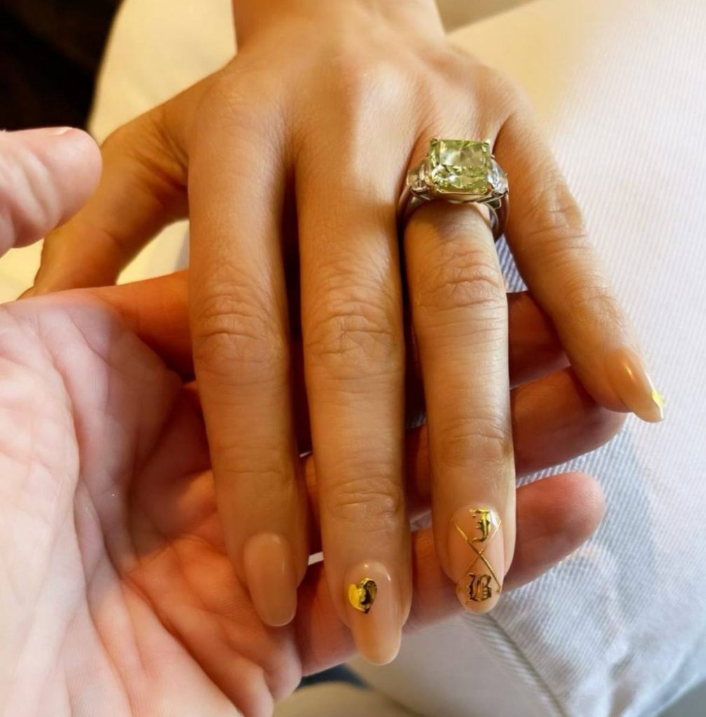 Спустя две недели тренд пошел дальше — его подхватила Джей Ло, сделав нюдовый маникюр с добавлением золотых инициалов. На одном ногте были сразу две буквы — «J» в честь Дженнифер и «B» в честь Бена Аффлека. Так, безымянный палец был украшен и обручальным кольцом, и модным нейл-артом. Ким Кардашьян, Джей Ло, кто будет следующим?