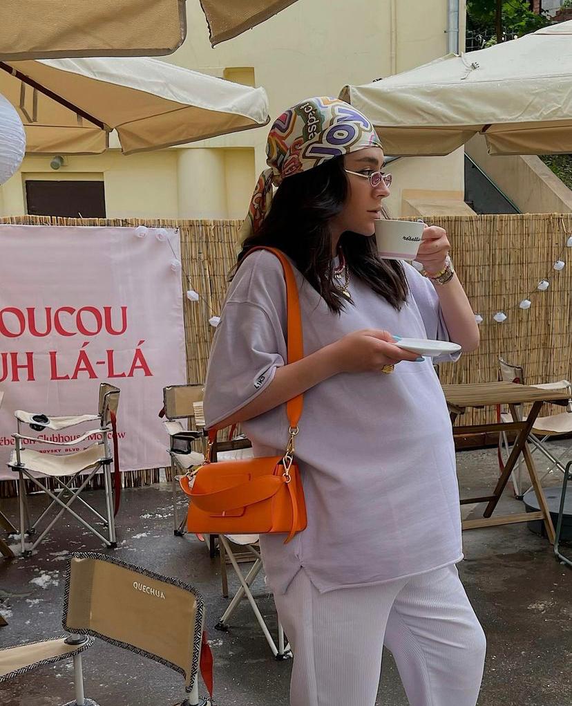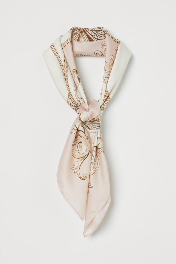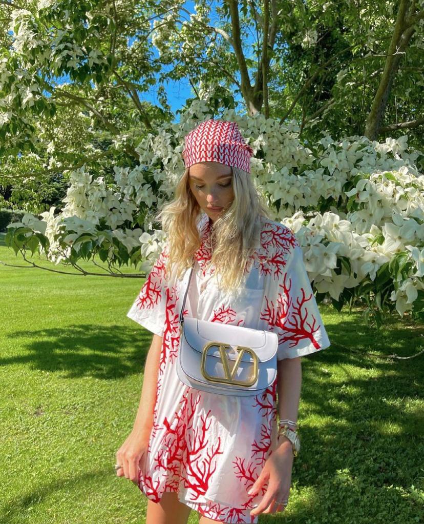 Выбирать можно самые разные варианты: например, остановиться на однотонном платке или добавить в образ модель с цветочным принтом. Мы советуем обратить внимание на аутфит Эльзы Хоск: модель носит яркий шелковый шарф с монограммой.