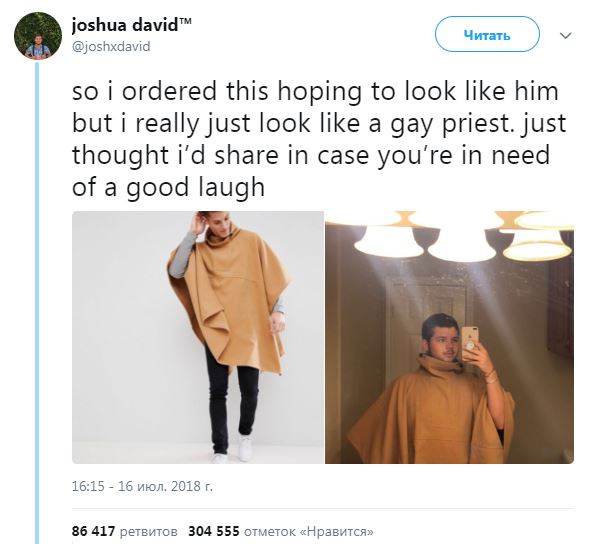 Только вот то, что пришло, не очень похоже на фото с сайта. Это не бежевое пончо, а настоящая плащ-палатка. «Я заказал это и думал, что буду выглядеть как он, а на самом деле я похож на священника и гея», — написал Джошуа в Twitter.