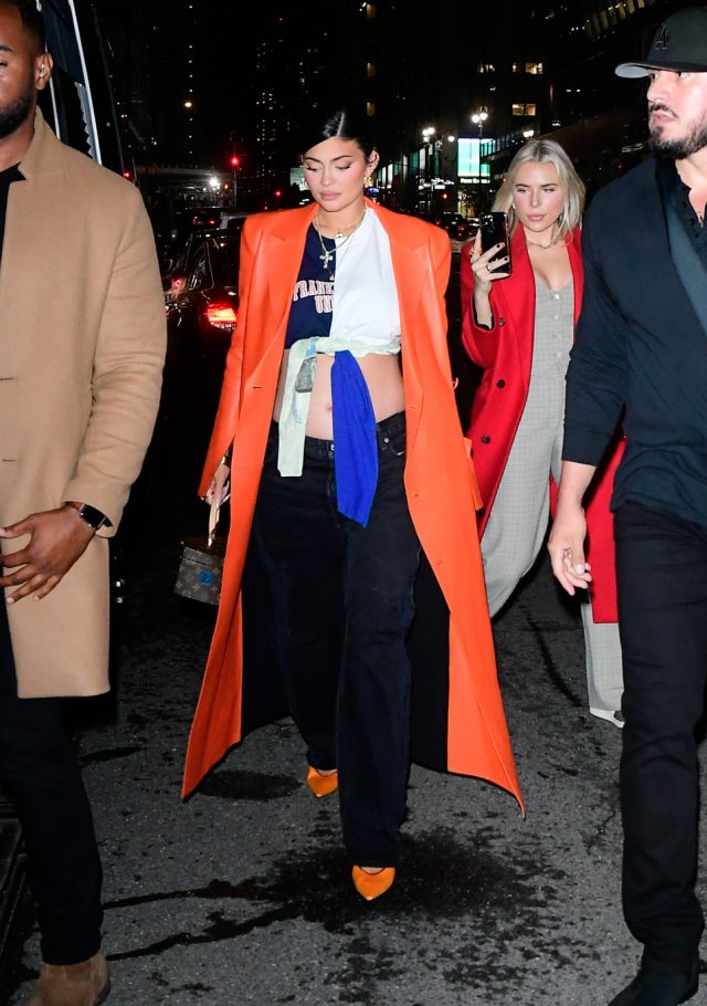 В ярко-оранжевом тренче появилась и Кайли Дженнер. Для выхода звезда выбрала модель из коллекции Off-White, дополнив образ черными джинсами прямого кроя и топом.