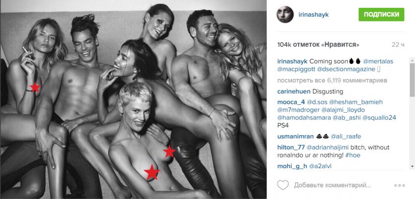 Об этом можно судить по Instagram модели Ирины Шейк (29), которая 20 сентября опубликовала весьма пикантную фотографию из новой фотосессии для «Dsection». На снимке запечатлена группа совершенно голых моделей, среди которых Ирина и ее русская коллега Наталья Поли (30). Они весело проводят время в компании двух парней, один из которых достаточно фривольно держит Ирину за ягодицы.