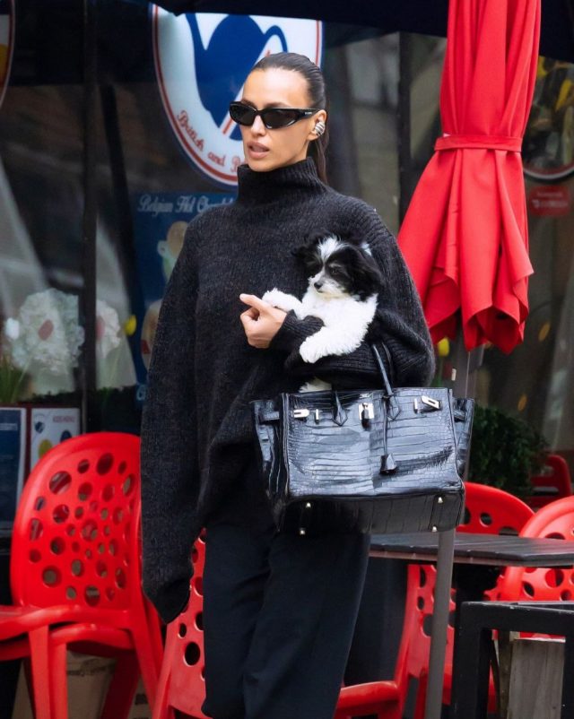 Ирина Шейк выбрала для выхода свитер и брюки, все в темных тонах. Глаза модели закрыли солнцезащитные очки. А вот в руках, кроме сумки Hermes, уместился четвероногий друг. И что особенно удивило подписчиков, это был не привычный и так полюбившийся всем мальтипу Арахис.