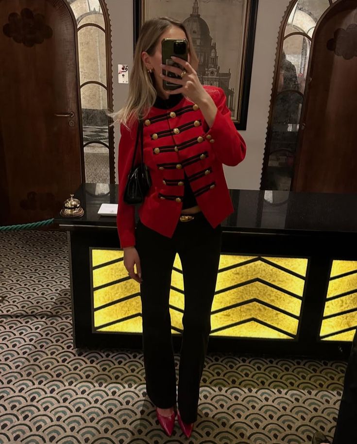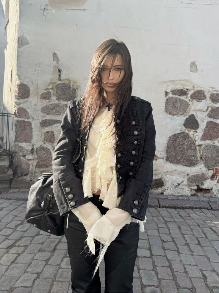 Неудивительно, что гусарские жакеты так полюбились фэшн-инфлюенсерам. Они идеально вписываются в тренд на исторический шик и ретро-романтизм, который стремительно набирает обороты. На подиумах их уже показали McQueen и Ann Demeulemeester, а самые преданные тренду охотятся за винтажом или редкими моделями Saint Laurent времен Эди Слимана. Носят такие жакеты с чем угодно – от строгих черных брюк и широких джинсов до мини-юбок и полупрозрачных платьев, создавая мягкий, но выразительный контраст.