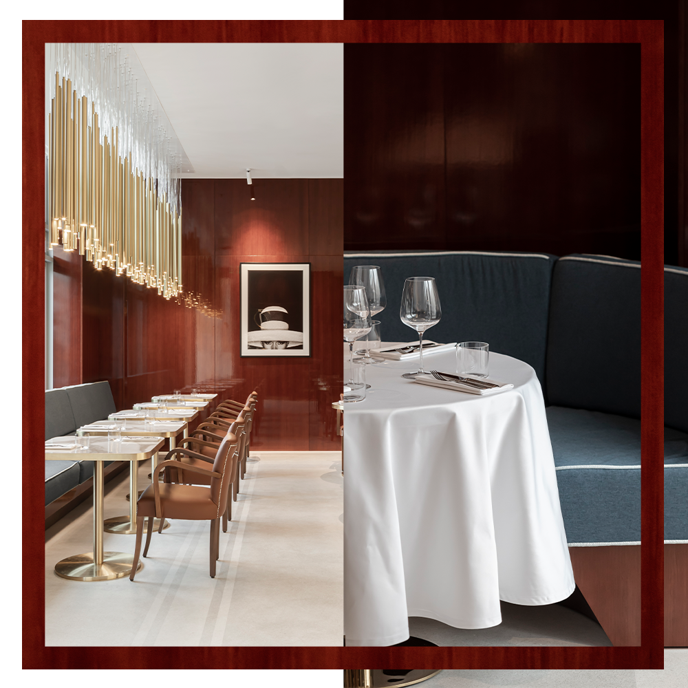 Дизайн напоминает интерьер роскошной яхты с красным деревом на стенах. В отделке использованы панели из лакированного дерева в сочетании с латунными деталями, которые идеально дополняют изысканный стиль ресторана.