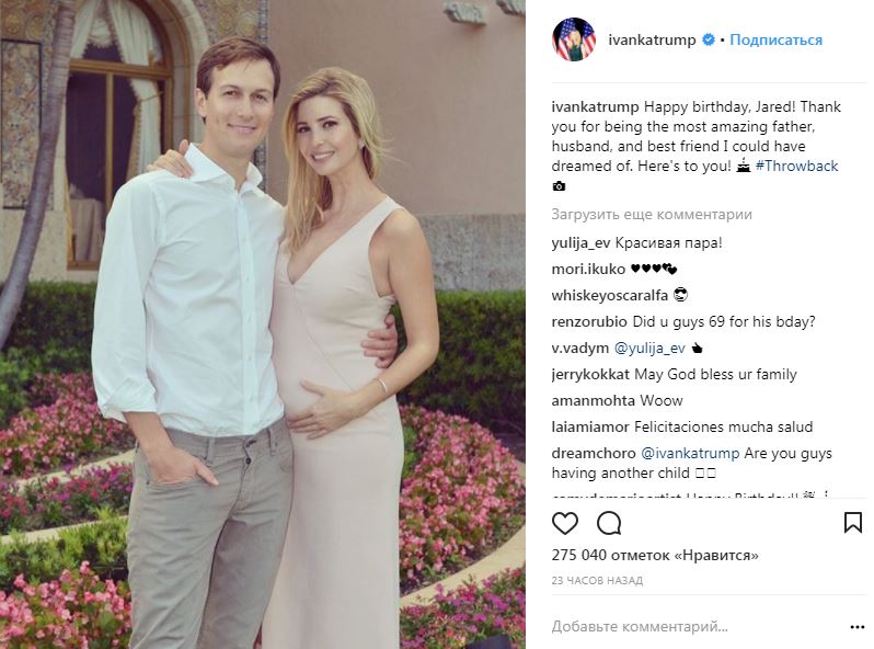 Вчера муж Иванки Трамп (36) Джаред Кушнер отметил день рождения – правой руке президента США Дональда Трампа (71) исполнилось 37 лет. Иванка очень трогательно поздравила супруга, а заодно и ввела всех в заблуждение. Она выложила совместное фото, на котором видно ее округлившийся животик, и подписала его: «С днем рождения, Джаред. Спасибо за то, что ты самый лучший отец, муж и лучший друг, о котором я могла только мечтать».