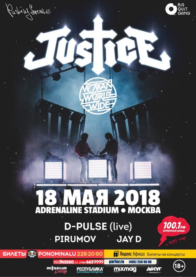 Justice едут в Москву с первым и единственным live-шоу в России в рамках мирового тура, посвященного альбому Woman, вышедшему в 2016 году. Концерт пройдет 18 мая на площадке Adrenaline Stadium. В программе — микс из техно, поп, R&B, электро, фанка и метала. Ребята везут масштабное световое и звуковое шоу, такого в Москве еще не было.