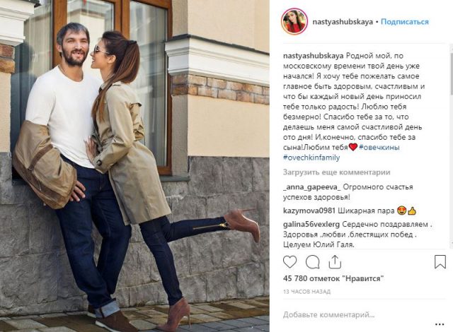 Одной из первых спортсмена поздравила его супруга Анастасия Шубская (24). В своем Instagram она написала: «Родной мой, по московскому времени твой день уже начался! Я хочу тебе пожелать самое главное быть здоровым, счастливым и что бы каждый новый день приносил тебе только радость! Люблю тебя безмерно! Спасибо тебе за то, что делаешь меня самой счастливой день ото дня! И,конечно, спасибо тебе за сына! Любим тебя #овечкины #ovechkinfamily». Как трогательно!