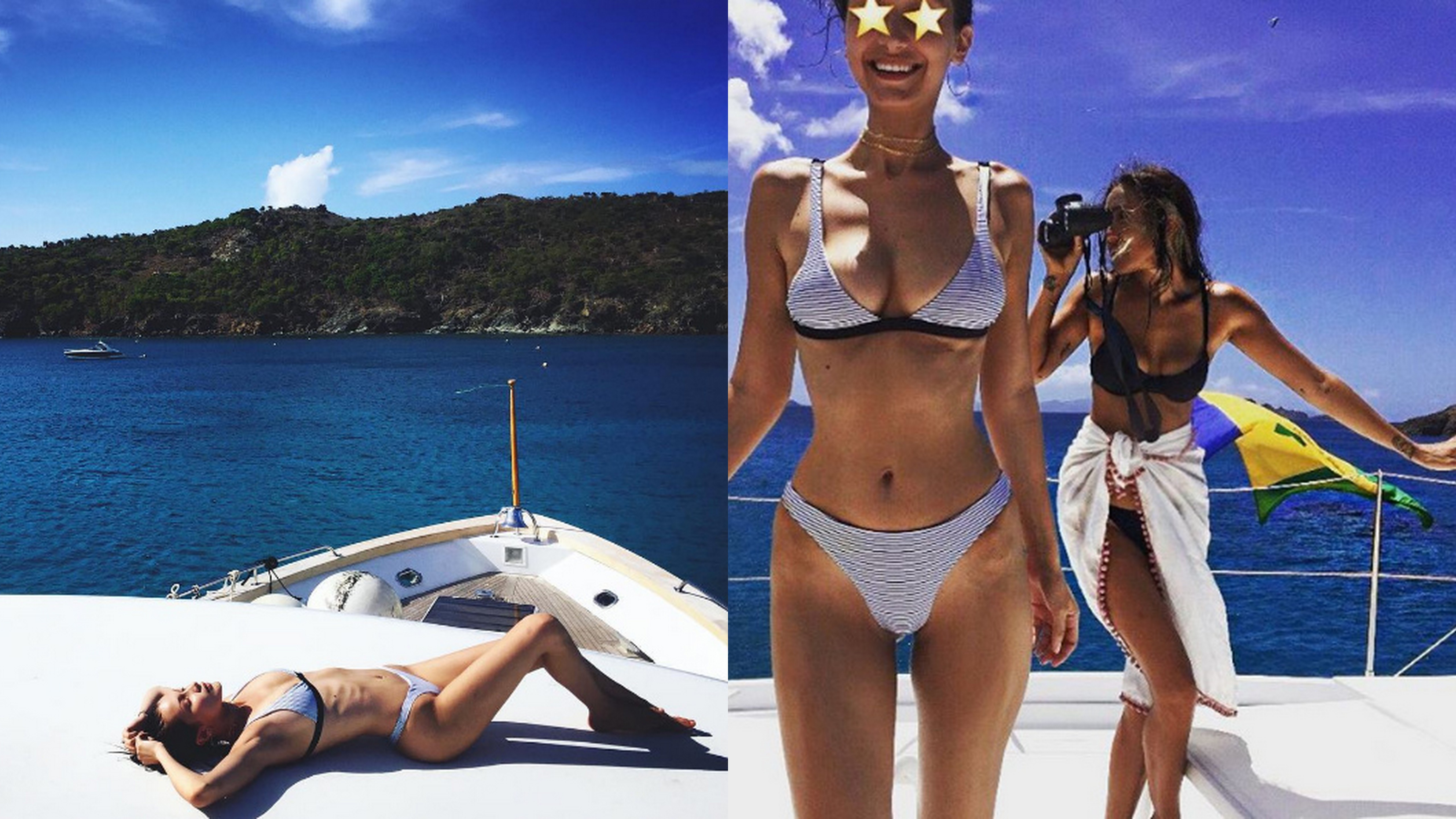 Уже неделю Белла Хадид (19) ест пиццу, пьет вино, загорает на пляже и ныряет в Карибское море.