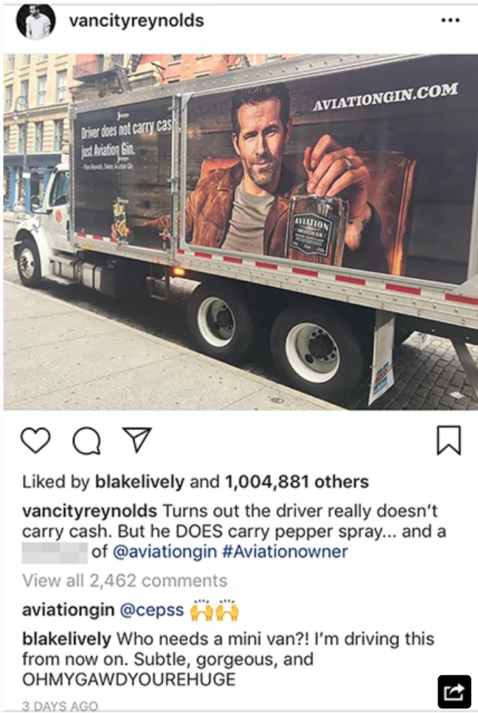 Актер опубликовал в Instagram фото грузовика, на котором красуется кадр из рекламной кампании его собственной алкогольной марки Aviation Gin. На снимке Райан наслаждается джином. Блейк не могла оставить этот пост без внимания: «Кому нужен минивэн? Теперь такой грузовичок вожу я. Такой тонкий и великолепный! О боже, какой же ты огромный!».