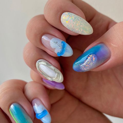 Для красоты картины мастера добавляют мерцающие элементы, неон и стразы. Особой популярностью пользуются природные дизайны — имитация камней и драгоценных пород. Другой актуальный вариант — нагромождение прозрачного покрытия, похожего на стекло или застывшие капли воды.