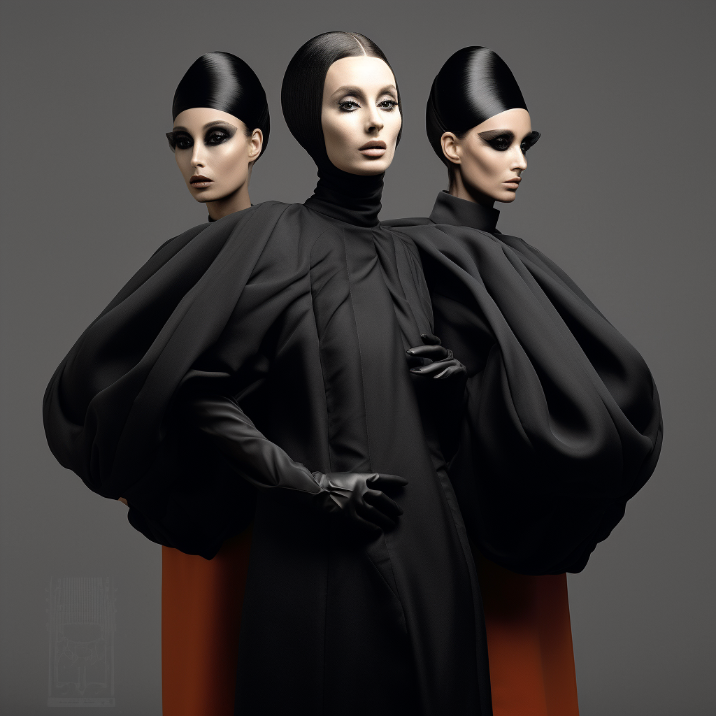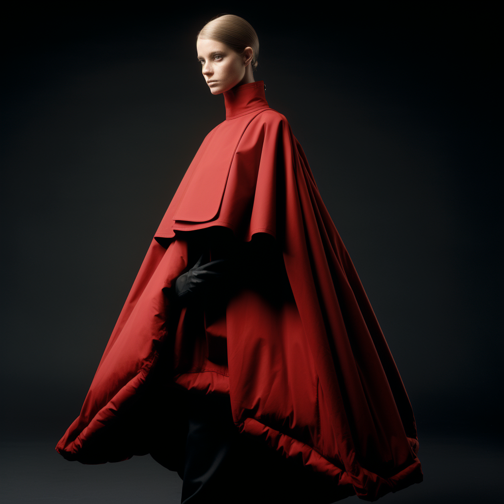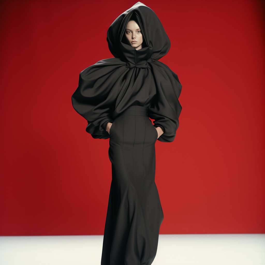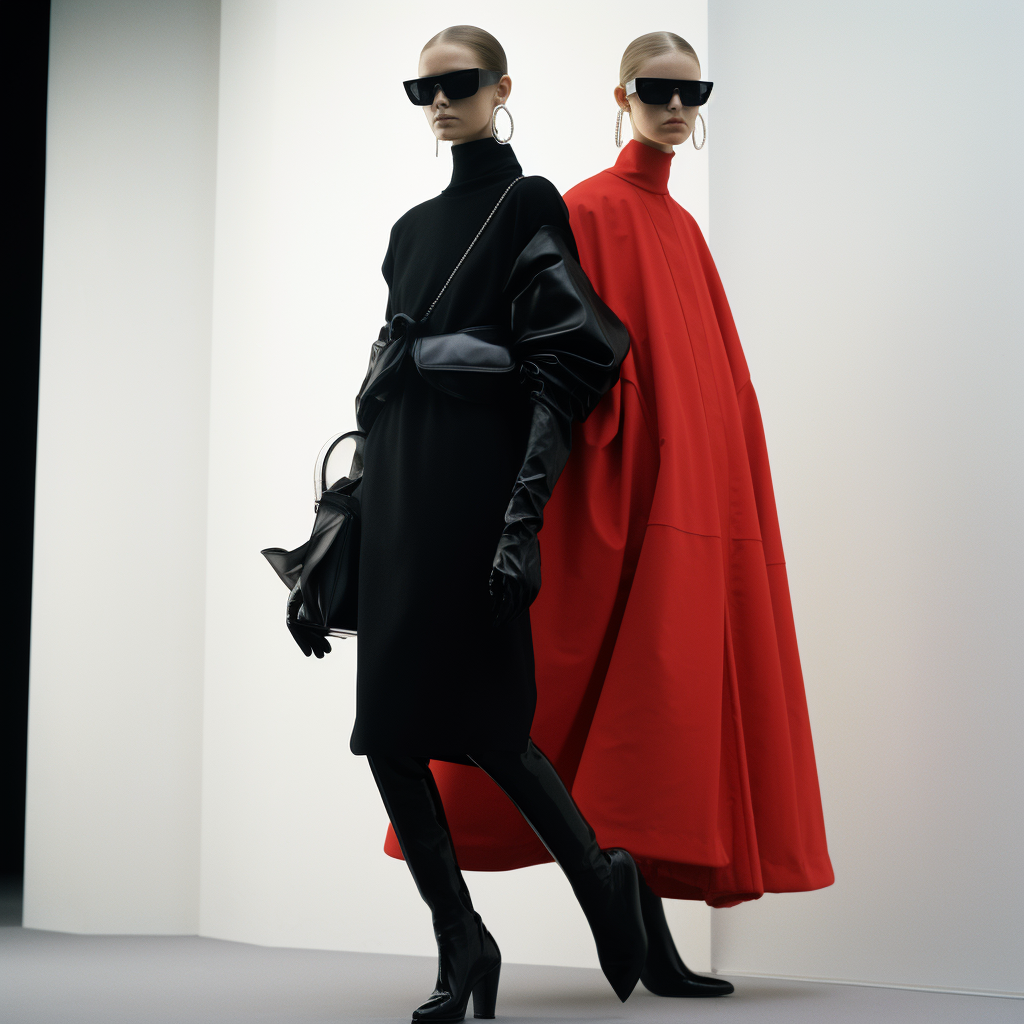 Кристобаль Баленсиага всегда считался чуть ли не главным новатором индустрии. Баскский дизайнер не боялся экспериментировать с кроем и представлял миру абсолютно новые идеи. К примеру, именно он придумал юбку-баллон (о которой сейчас мечтает каждая девушка), предложил носить вещи с рукавами ¾ и создал знаменитое пальто-кокон. Нынешний креативный директор Balenciaga Демна Гвасалия очень тонко чувствует ДНК-бренда и нередко обращается к архивным творениям мэтра. Поэтому получившийся результат нейросети немного напоминает настоящие коллекции.