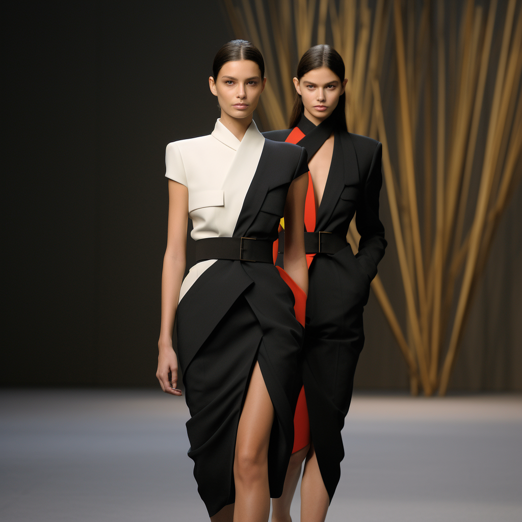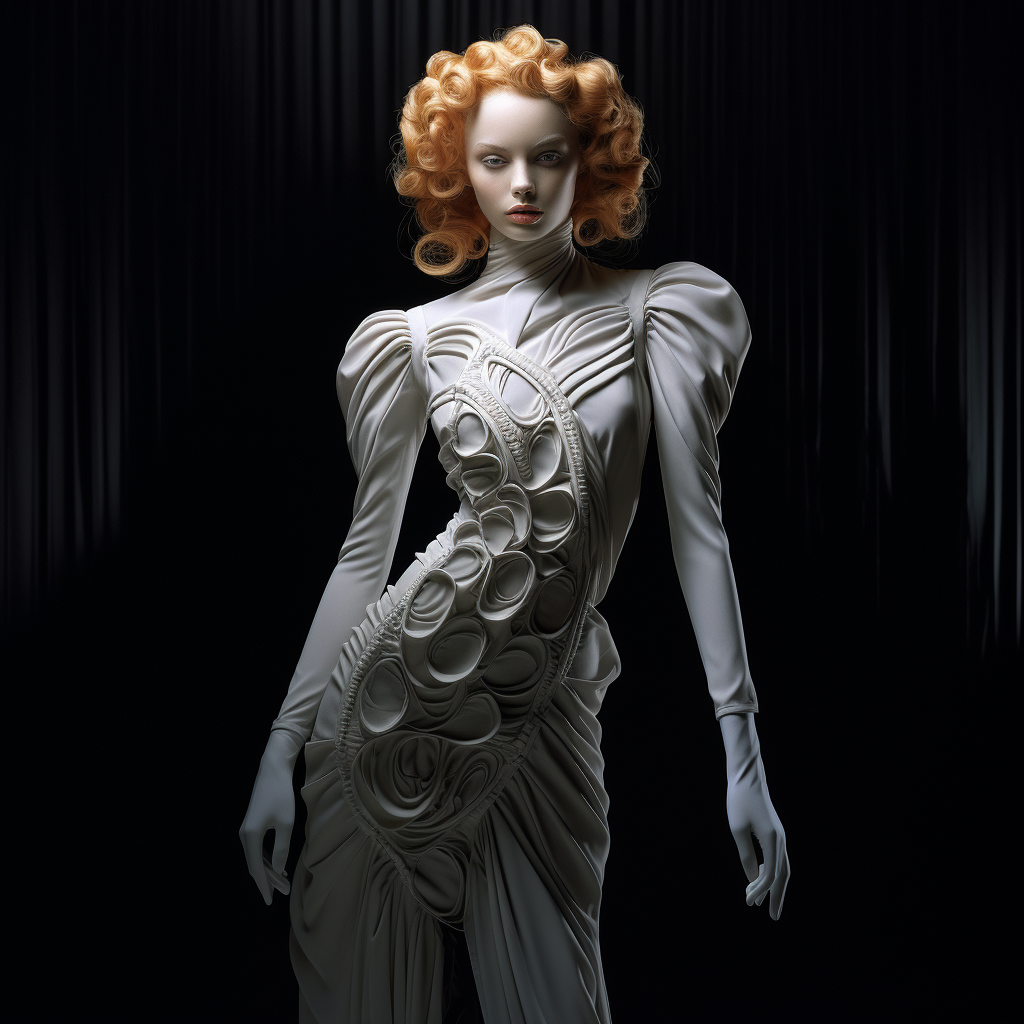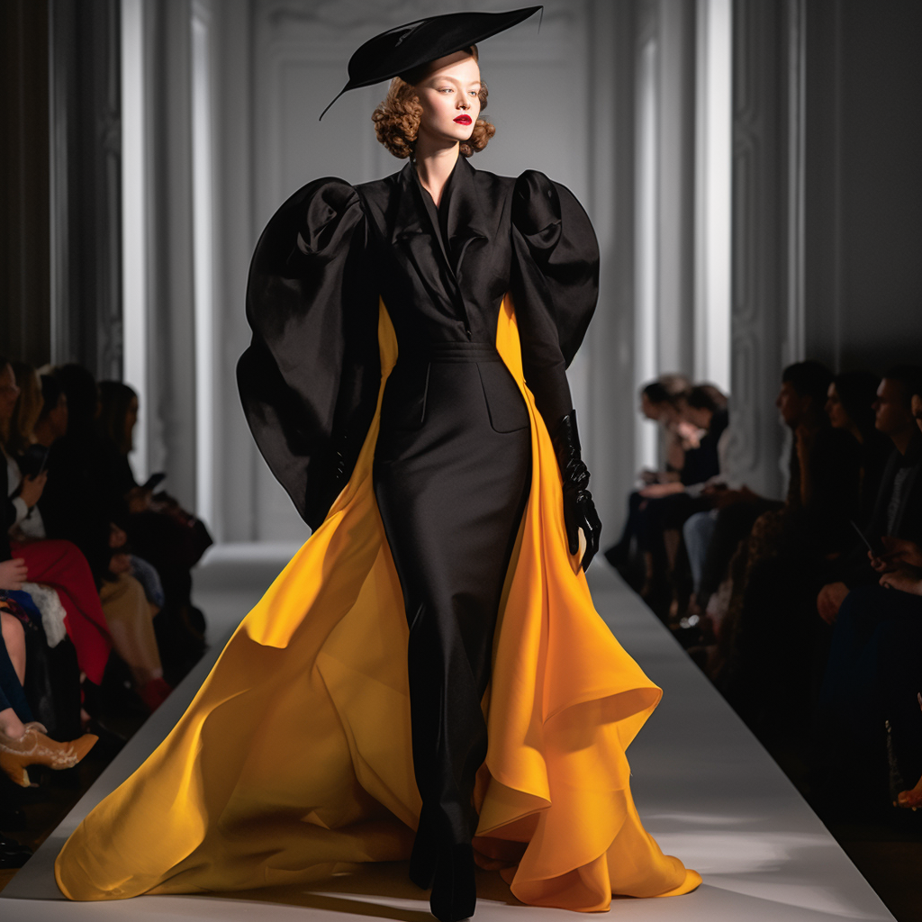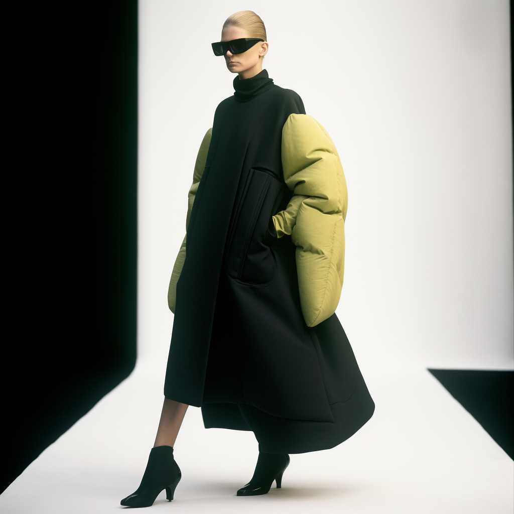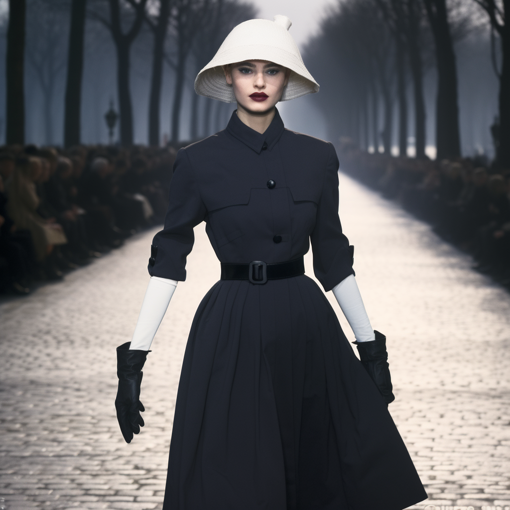 Кристобаль Баленсиага всегда считался чуть ли не главным новатором индустрии. Баскский дизайнер не боялся экспериментировать с кроем и представлял миру абсолютно новые идеи. К примеру, именно он придумал юбку-баллон (о которой сейчас мечтает каждая девушка), предложил носить вещи с рукавами ¾ и создал знаменитое пальто-кокон. Нынешний креативный директор Balenciaga Демна Гвасалия очень тонко чувствует ДНК-бренда и нередко обращается к архивным творениям мэтра. Поэтому получившийся результат нейросети немного напоминает настоящие коллекции.