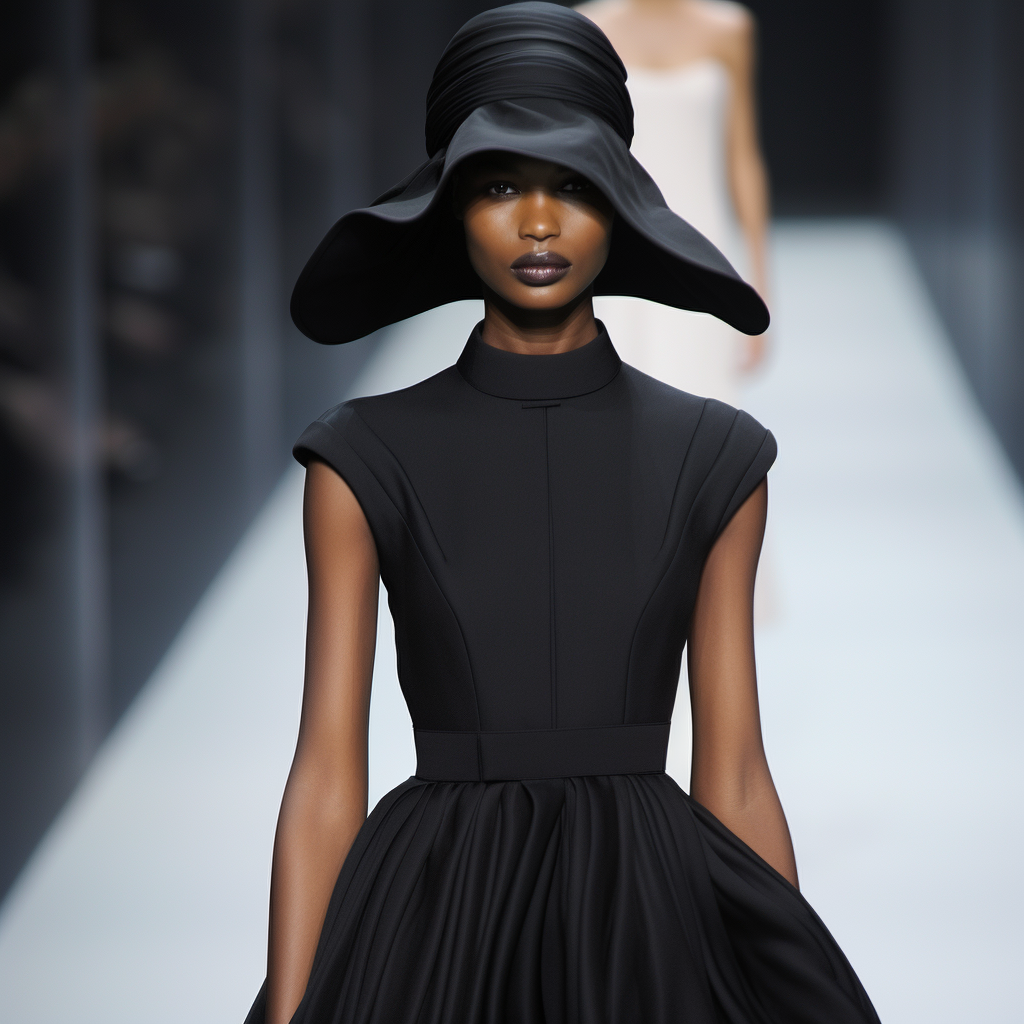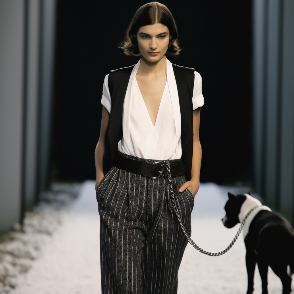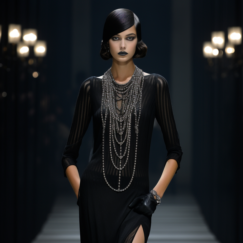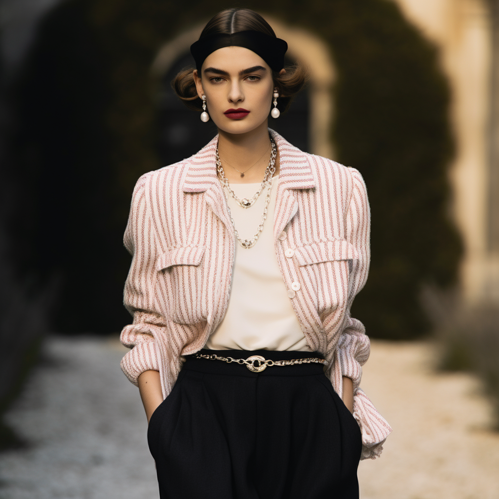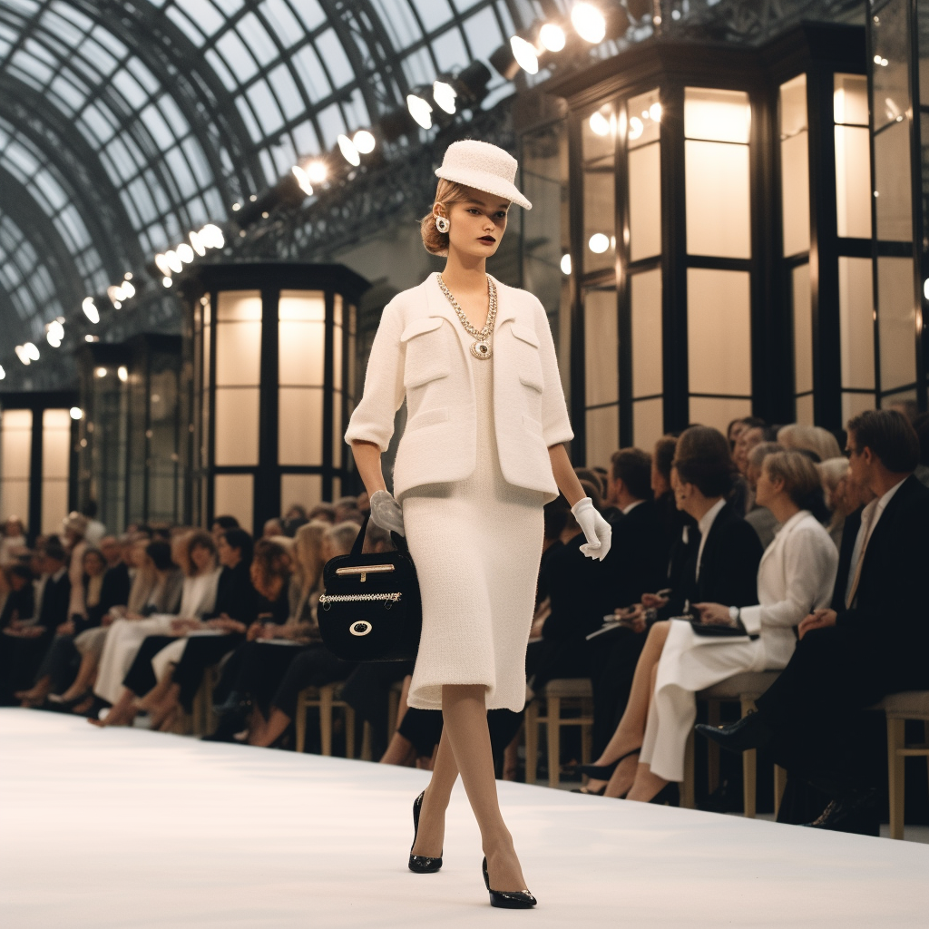 Коко Шанель, в отличие от Эльзы Скиапарелли, терпеть не могла эпатаж. На протяжении всего творческого пути она отдавала предпочтение практичности и комфорту. Не будем забывать, что именно Габриель Шанель предложила женщинам позаимствовать несколько вещей (включая брюки) из гардероба своего бойфренда. Так, в коллекции, сгенерированной нейросетью мы видим твидовые костюмы актуальных силуэтов, обилие жемчуга, облегающие черные платья (в этом сезоне тренд на bodycon набирает обороты) и идеальные жакеты.