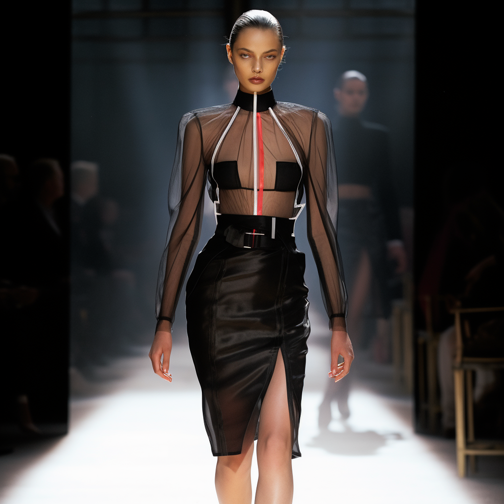 Если говорить про Кристиана Диора, первое, что приходит в голову – стиль New Look, предложенный дизайнером в 1947 году. Гений мира моды во всех своих творениях подчеркивал талию и делал ставку на юбки А-силуэта. А еще не будем забывать, что именно он предложил девушкам носить юбки-карандаши и барные жакеты. Проанализировав тренды этого сезона, нейросеть представила свое видение современных коллекций Кристиана Диора. Наш любимый образ – облегающая юбка с разрезом и прозрачная блуза, как отражение тренда на неприкрытую сексуальность.